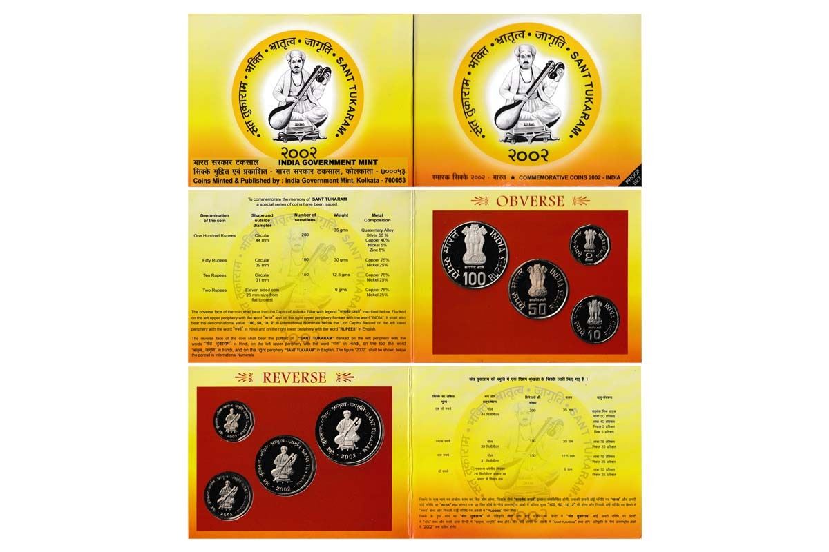 2002 Proof Set, Sant Tukaram, Set of 4 Coins, Rupees 100, 50, 10, and 2. Immaculate condition with original packing (4).