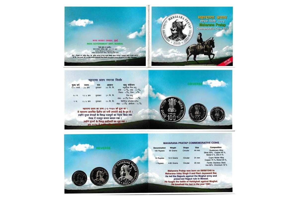 2003 UNC Set, Maharana Pratap, Set of 3 Coins, Rupees 100, 10, and 1. Immaculate condition with original packing (3).