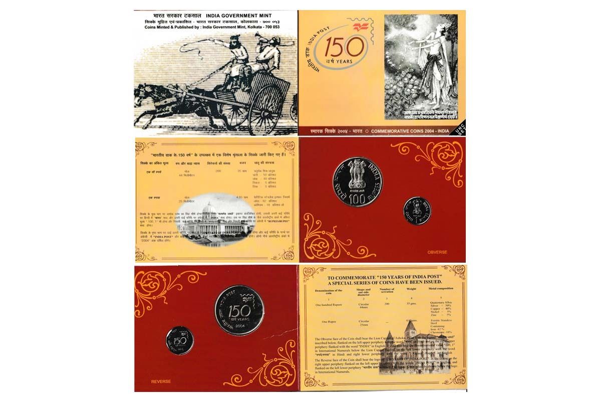 2004 UNC Set, 150 Years of India Post, Set of 2 Coins, Rupees 100 and 1. Immaculate condition with original packing (2).
