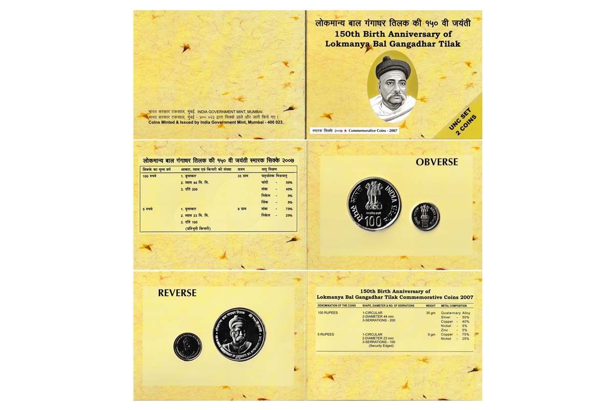 2007 UNC Set, Bal Gangadhar Tilak (150th Birth Anniversary), Set of 2 Coins, Rupees 100 and 5. Immaculate condition with original packing (2).