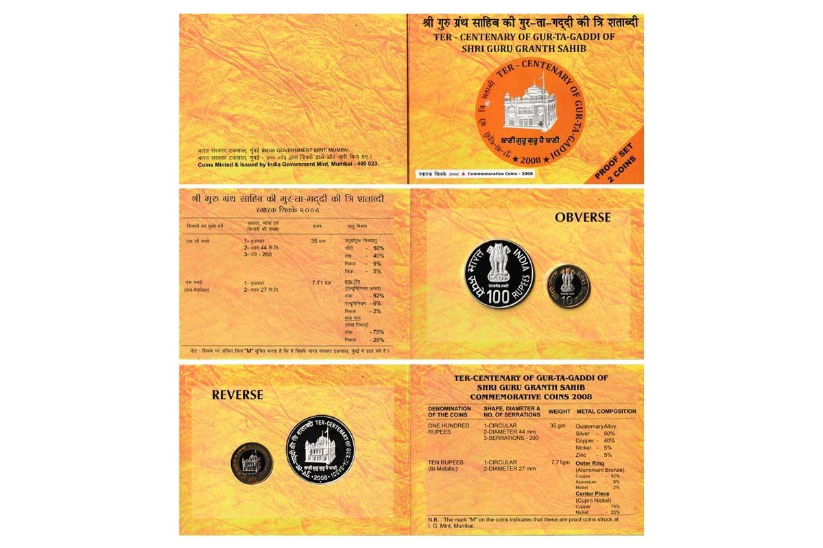 2008 Proof Set, Centenary of Gur-Ta-Guddi of Shri Guru Granth Sahib, Set of 2 Coins, Rupees 100 and 10. Immaculate condition with original packing (2).