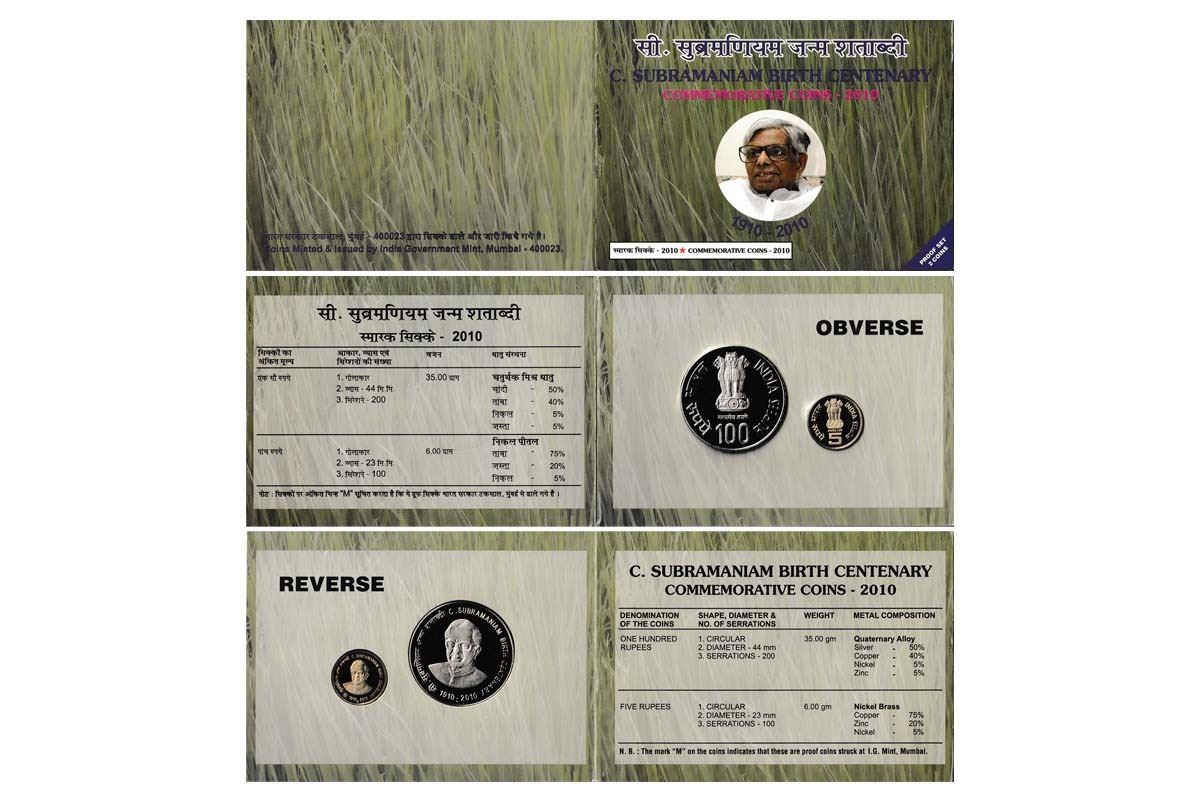 2010 Proof Set, C. Subramaniam Birth Centenary, Set of 2 Coins, Rupees 100 and 5. Immaculate condition with original packing (2).