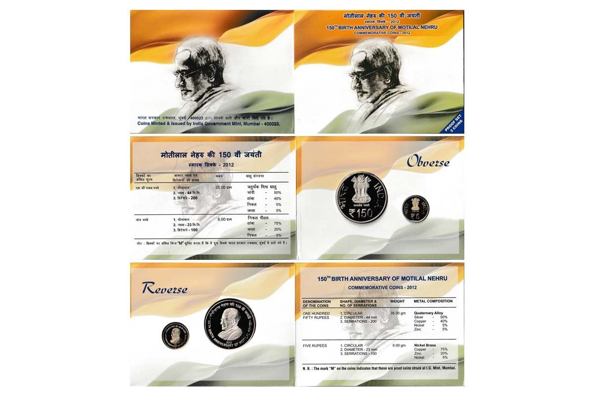 2012 Proof Set, Motilal Nehru (150th Birth Anniversary), Set of 2 Coins, Rupees 150 and 5. Immaculate condition with original packing (2).