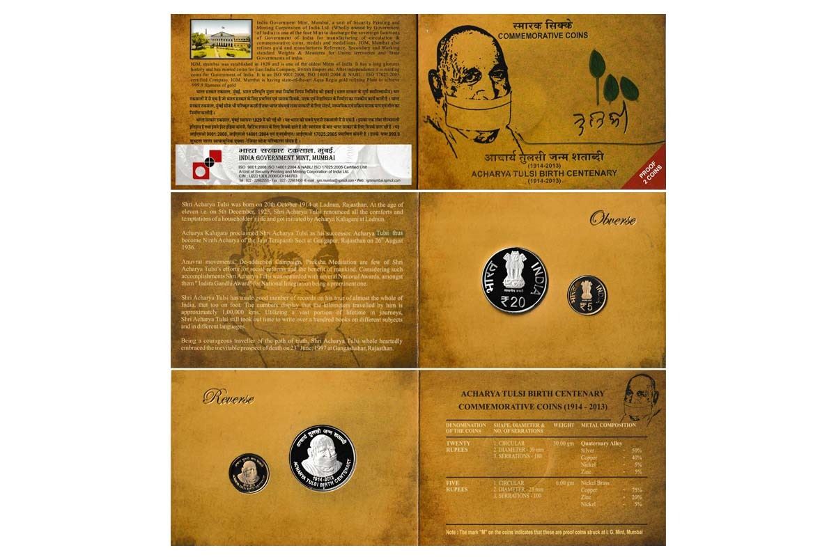 2014 Proof Set, Acharya Tulsi Birth Centenary 1914-2014, Set of 2 Coins, Rupees 20 and 5. Immaculate condition with original packing (2).