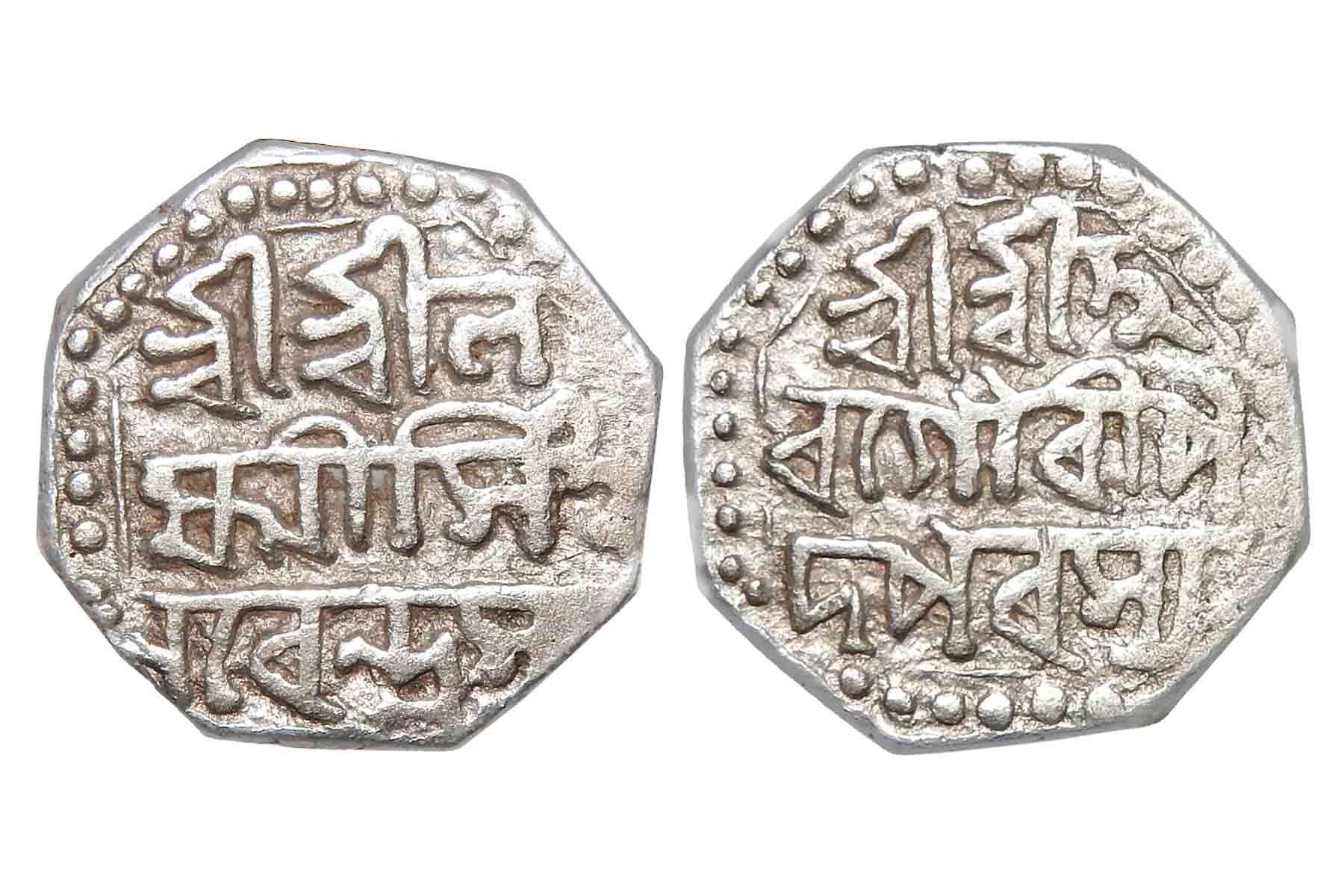 Assam, Ahom Kingdom, Lakshmi Simha (c.1769-1780), Half Rupee Silver, 5.70 grams, Obv. Sri Sri La / lakshmi Simha / Nripasya, Rev. Sri Sri Hara Gauri legend in Bengali “sri sri ha/ra gauri pa/da parasya”, (KM 178), Very Fine.