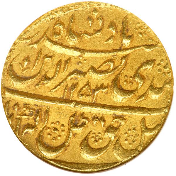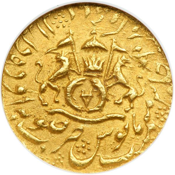 India - Awadh. Gold Ashra (Mohur), AH1253 Year 10. Fr-1013 var; KM-date unlisted. Nasir Al-Din Haider, AH1243-1253 (1827-1837AD). Suba Awadh Dar al-Sultanat Lakhnau. Reverse: Coat of arms. Rare. NGC graded MS-62.