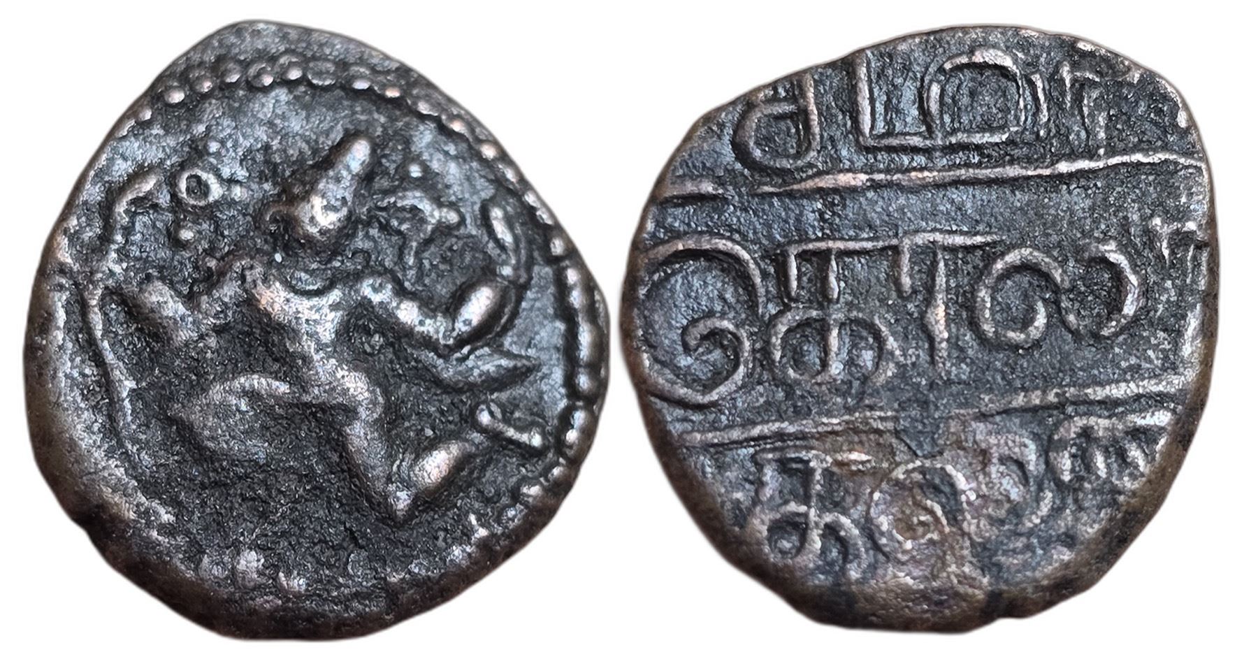 Banas of Madurai -Samarakolakalan as feudatories of Vijayanagar- 15th century. AE Unit, 3.33 g , 18.27 mm. Obv: Garuda holding a snake running to left with Shankh and Chakra above. Rev: Tamil legend “Samara/kola/kalanâ€; The Coins of Tamilnadu, # 8.8, K.Ganesh. Good VF, Scarce. Estimate: $ 50-60