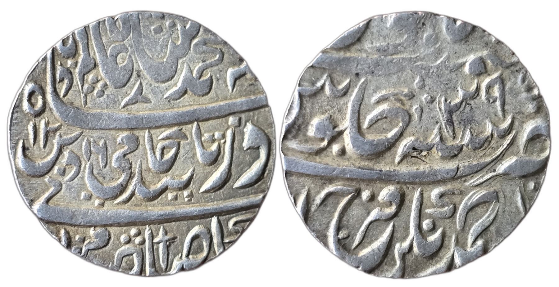 Bangash Nawabs of Farrukhabad: Nawab Amin ud-Dawla (AH 1210-1217, 1796-1802 CE), AR Rupee struck in the name of Mughal Emperor Shah Alam II. 1216 AH, Regnal Year 39, Ahmednagar Farrukhabad mint. (KM#28). 11.06 grams, 24.99 mm, Fine, Scarce. Estimate: $40-50