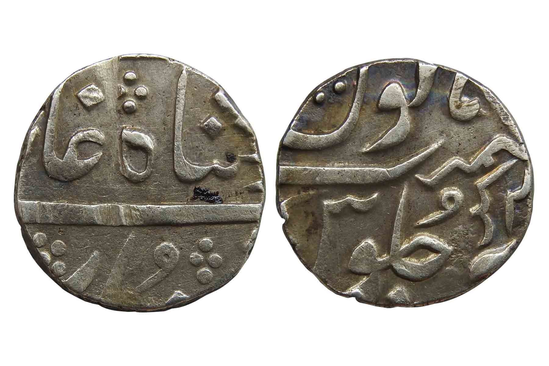 Baroda, Govindrao Gaikwad (c. 1875-1938 AD, VS 1932-1995), In name of Shah Alam II (c. 1759-1806), Silver Rupee, Baroda Mint, 11.30 grams, Obv. Shah Alam’s title, Rev. Persian letter “Go” (stands for Govindrao) above the word sanah, Sword in julus & RY 2(x), Very Fine, Very Rare.Note: Usually coins of Baroda, bears the ruler’s initials in Nagari, but in this early issue letter “Go” is in the Persian language. Unlisted in KM.