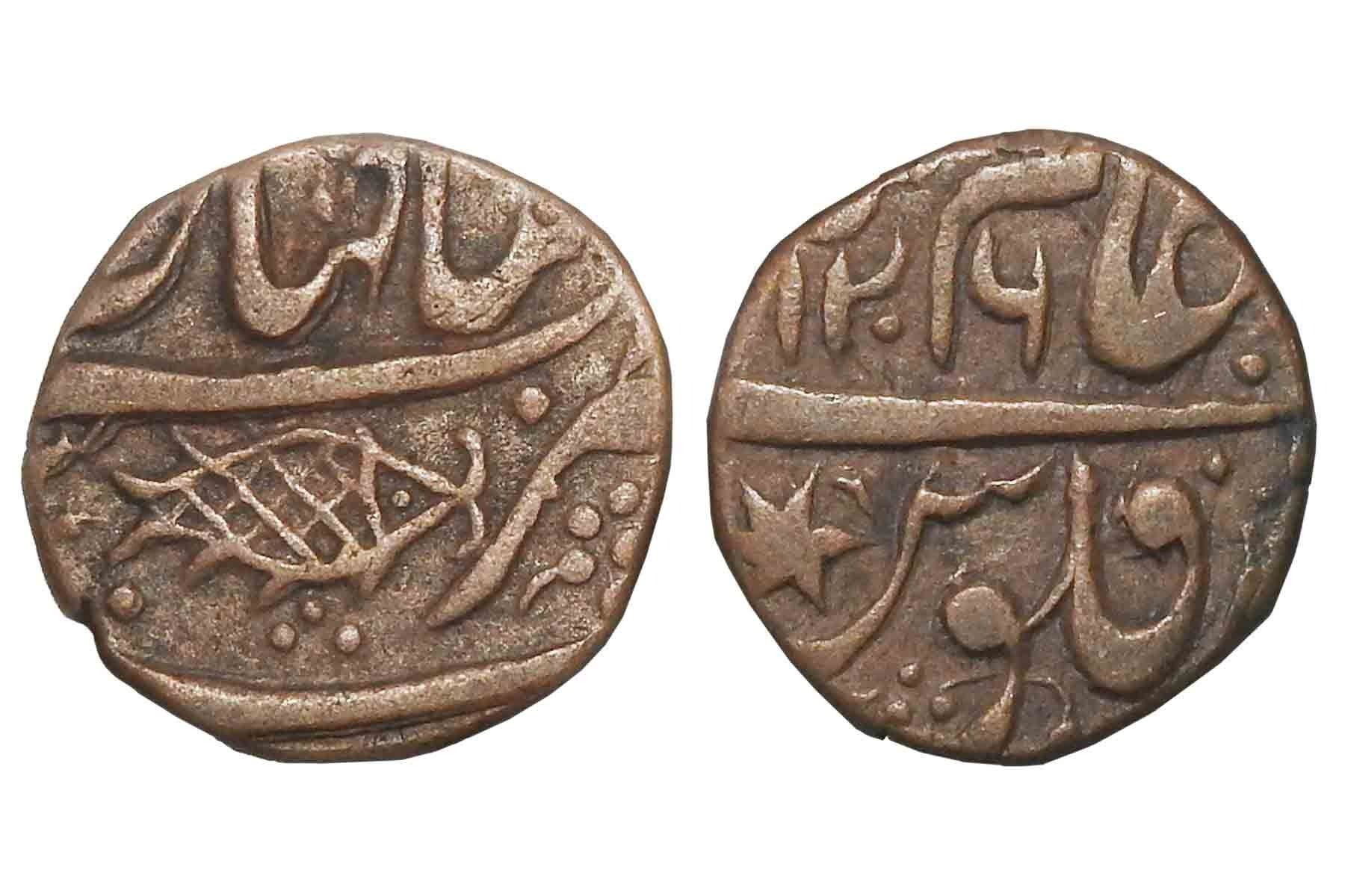 Bindraban, In name of Shah Alam II, (c. 1759-1806 AD), Copper Paisa, Shahjahanabad Mint, Obv. Fish towards right mintmark and Mint name at the top, Rev. Star Mintmark in julus, AH 1206, (KM 3), Extra Fine, Rare.