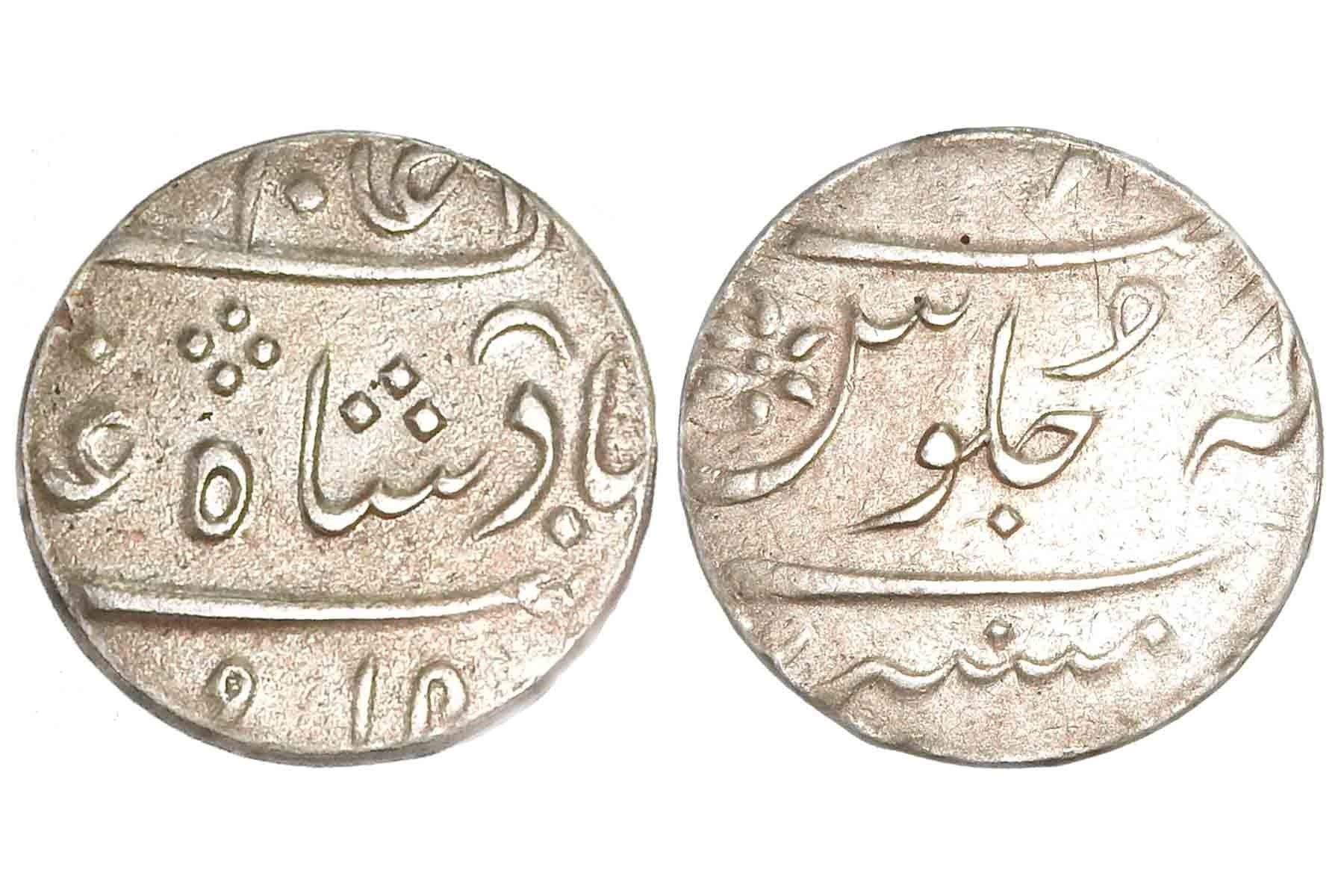 Bombay Presidency, Alamgir II, (c. 1754-1759 AD), Silver Rupee, Calcutta Mint, struck for use in Malabar Coast with distinguish features of an inverted crescent and neat appearance, 11.50 grams, Obv. Ruler’s title “Sikka Mubarak Badshah Ghazi Alamgir” with inverted crescent mark, Rev. Persian legend “Malus Memanat Sana Julus Zarb Mumbai” & Flower within sheen of Julus, (P.Stevens 7.18), Very Fine+, Rare.