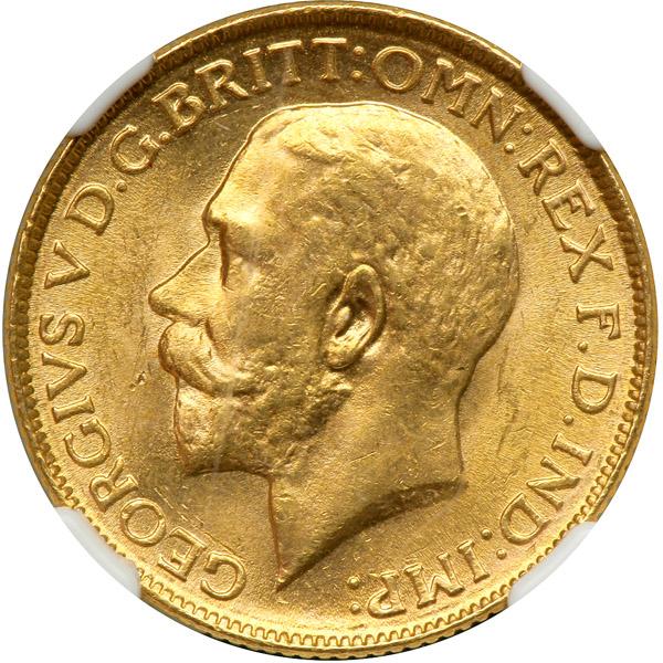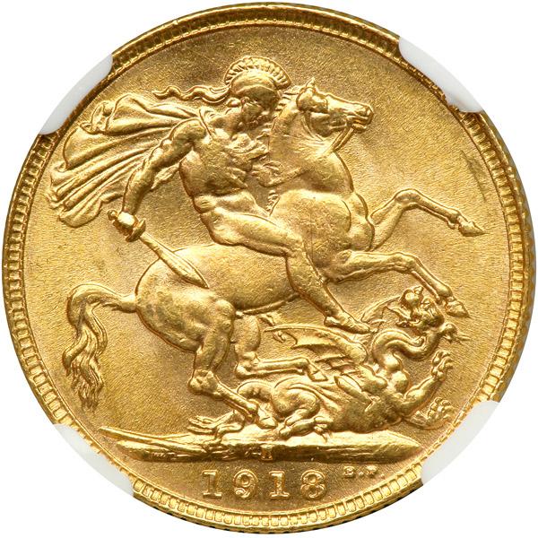 India- British. Sovereign, 1918-I. Fr-1609; KM-525A. Weight 0.2355 ounce. George V. One year type. NGC graded MS-62.