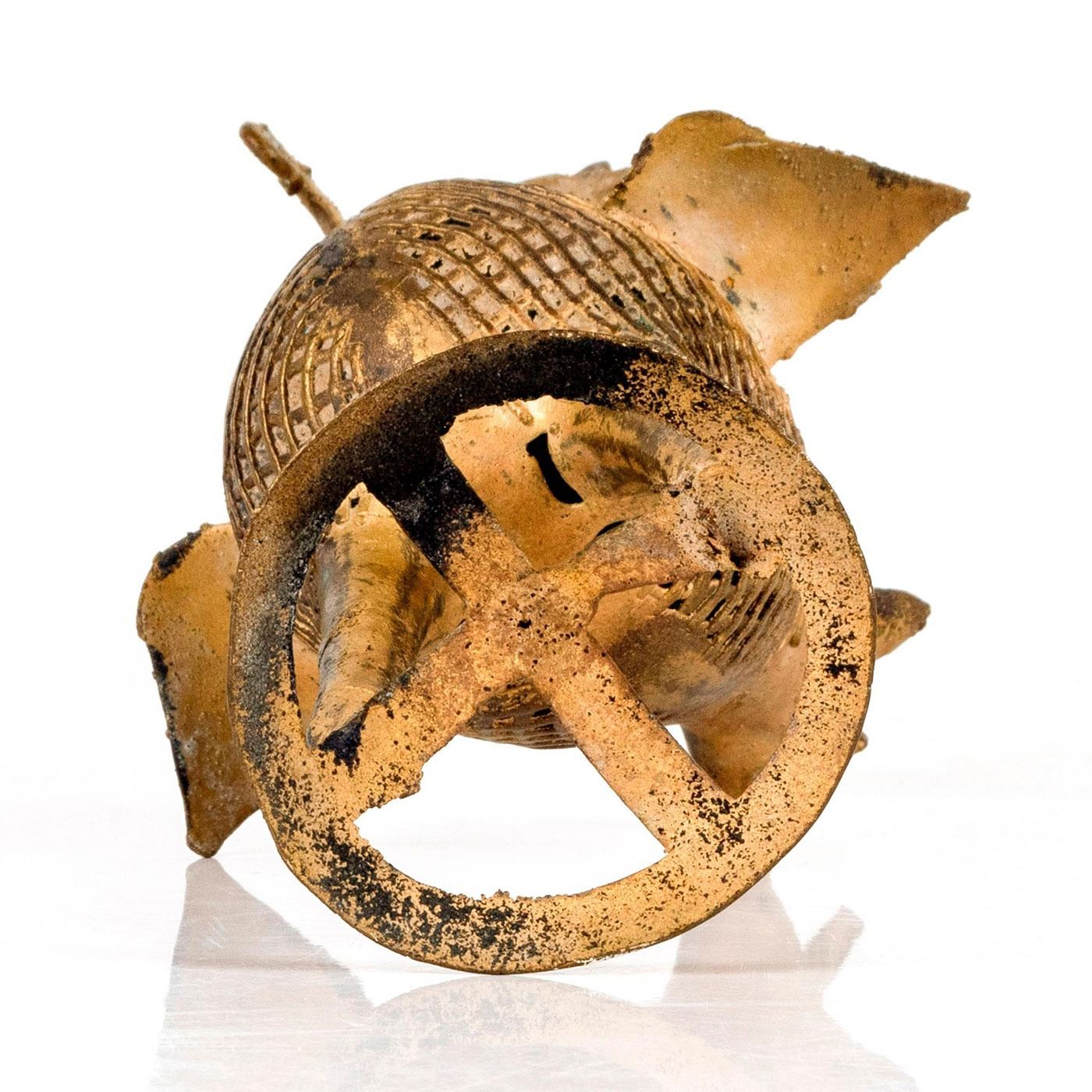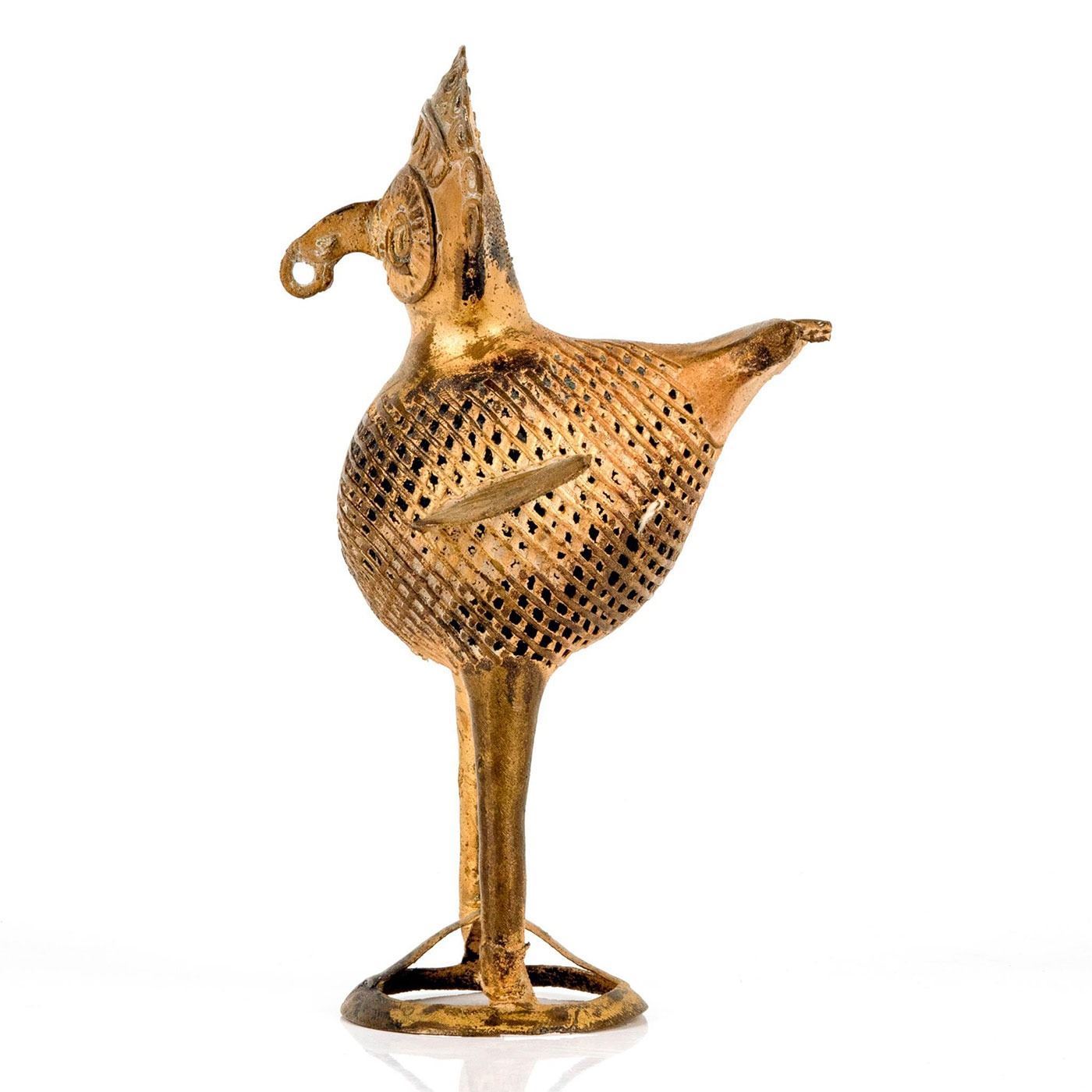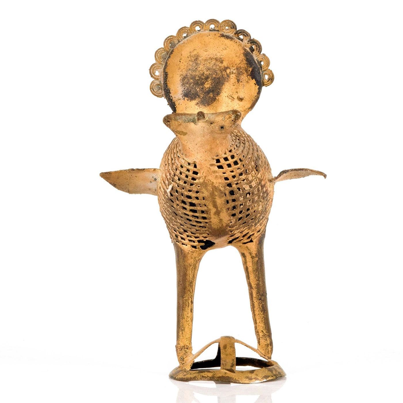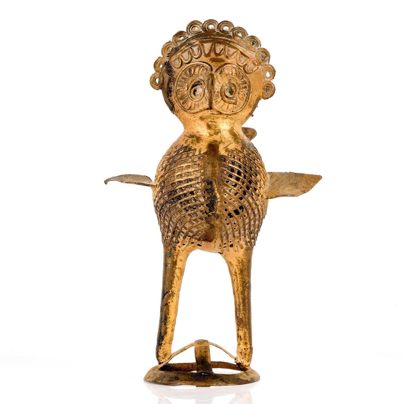 Bulbous bronze metal figurine with a lattice body and ornate face. Circular foot.