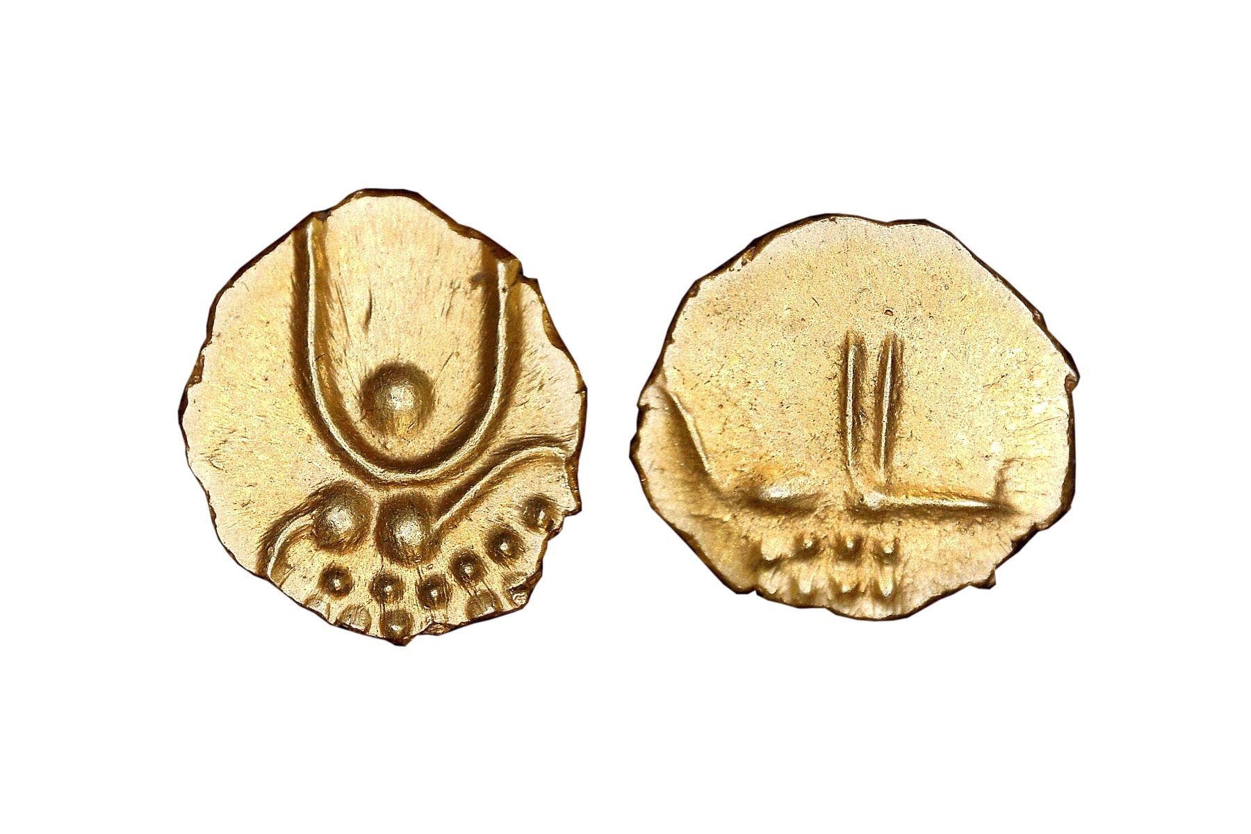 Cochin, Gold Fanam, 0.40 grams, Obv. A stylized Animal, Rev. Stylized Kali. Extremely Fine.