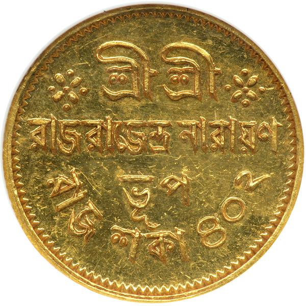 India - Cooch Behar. Mohur, CB402 (1912). Fr-1099; KM-200 (X#M8). Mintage only 100 pieces. Raja Rajendra Narayan, 1911-1913. Arms supported by lion and elephant. Reverse: Bengali legend and date. Choice and Extremely Rare. NGC graded MS-64.
