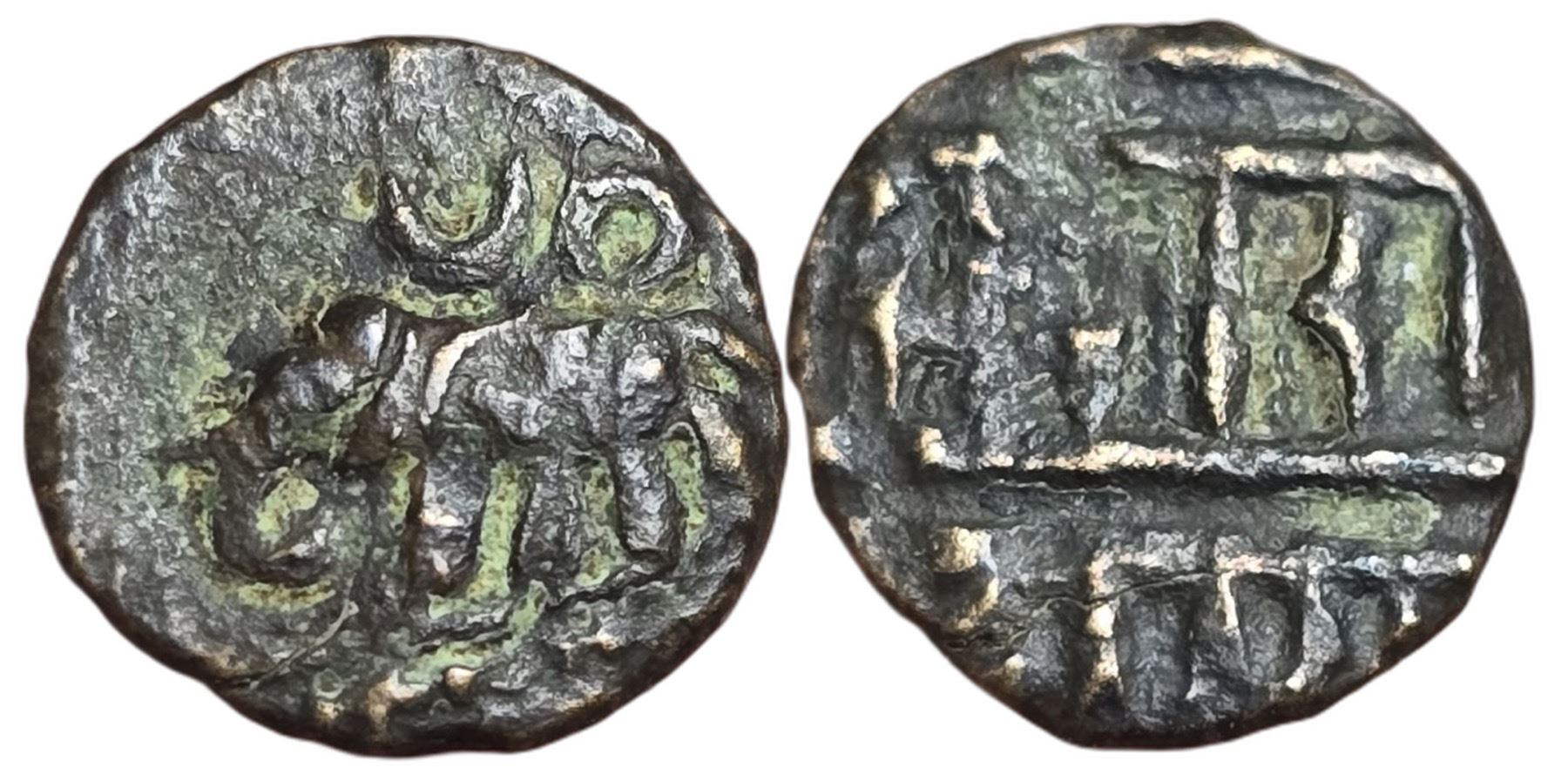 Feudatories of Vijayanagara. AE Unit, 0.66g , 9.86 mm. Obv: Elephant facing left with Sun and moon above. Rev:Pseudo Nagari legends imitating coins of Achyutaraya. Unpublished type. VF. Estimate: $ 150-200