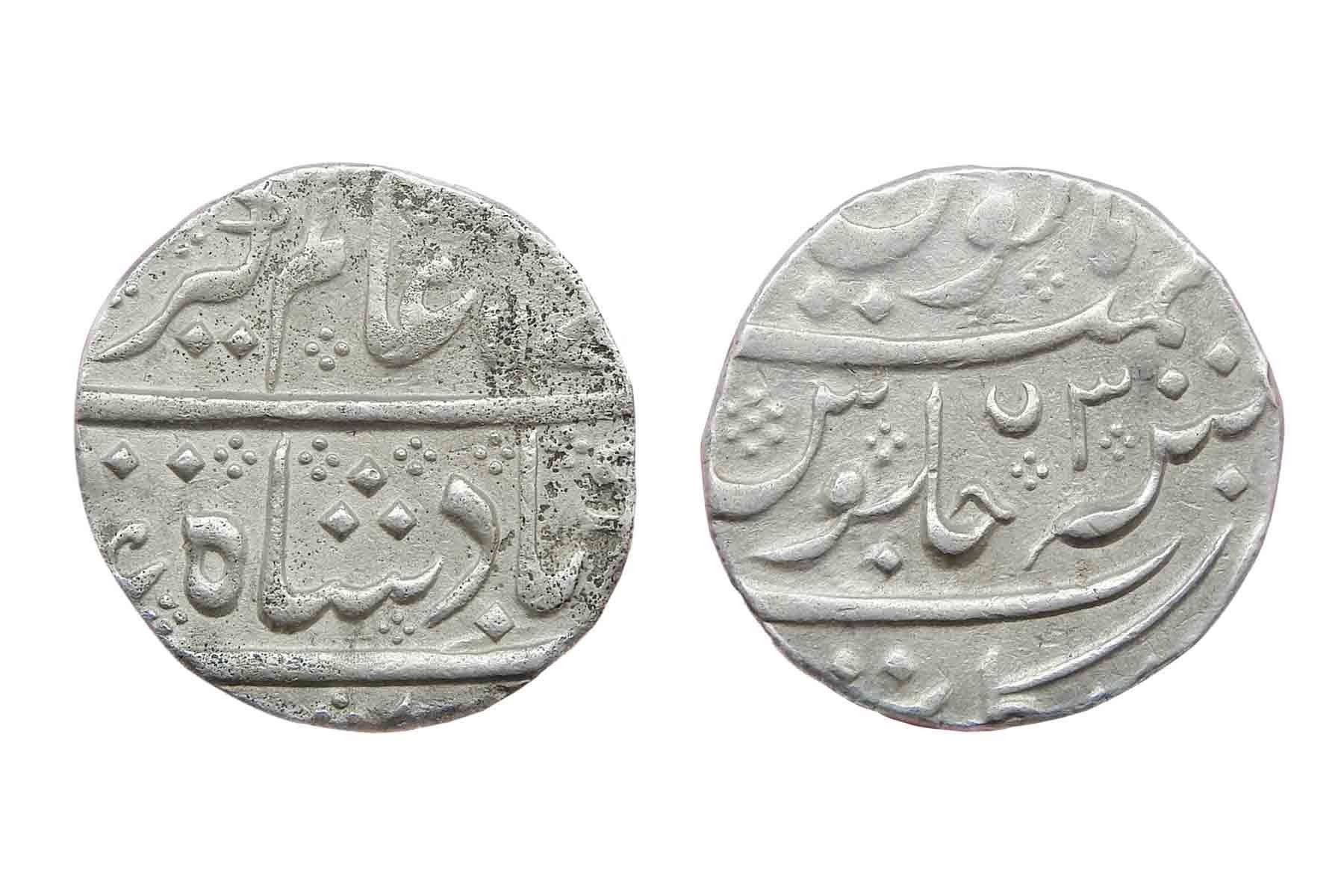 French India, In name of Alamgir II (c. 1754-1759), Silver Rupee, Arcot Mint (Minted at Pondicherry), 117(0) AH, Obv. Ruler’s title “Sikka Mubarak badshah ghazi Alamgir“, Rev. Malus memanat sana 3 julus & zarb Arcot at the bottom, Crescent mark, RY 3, Very Fine, Rare.