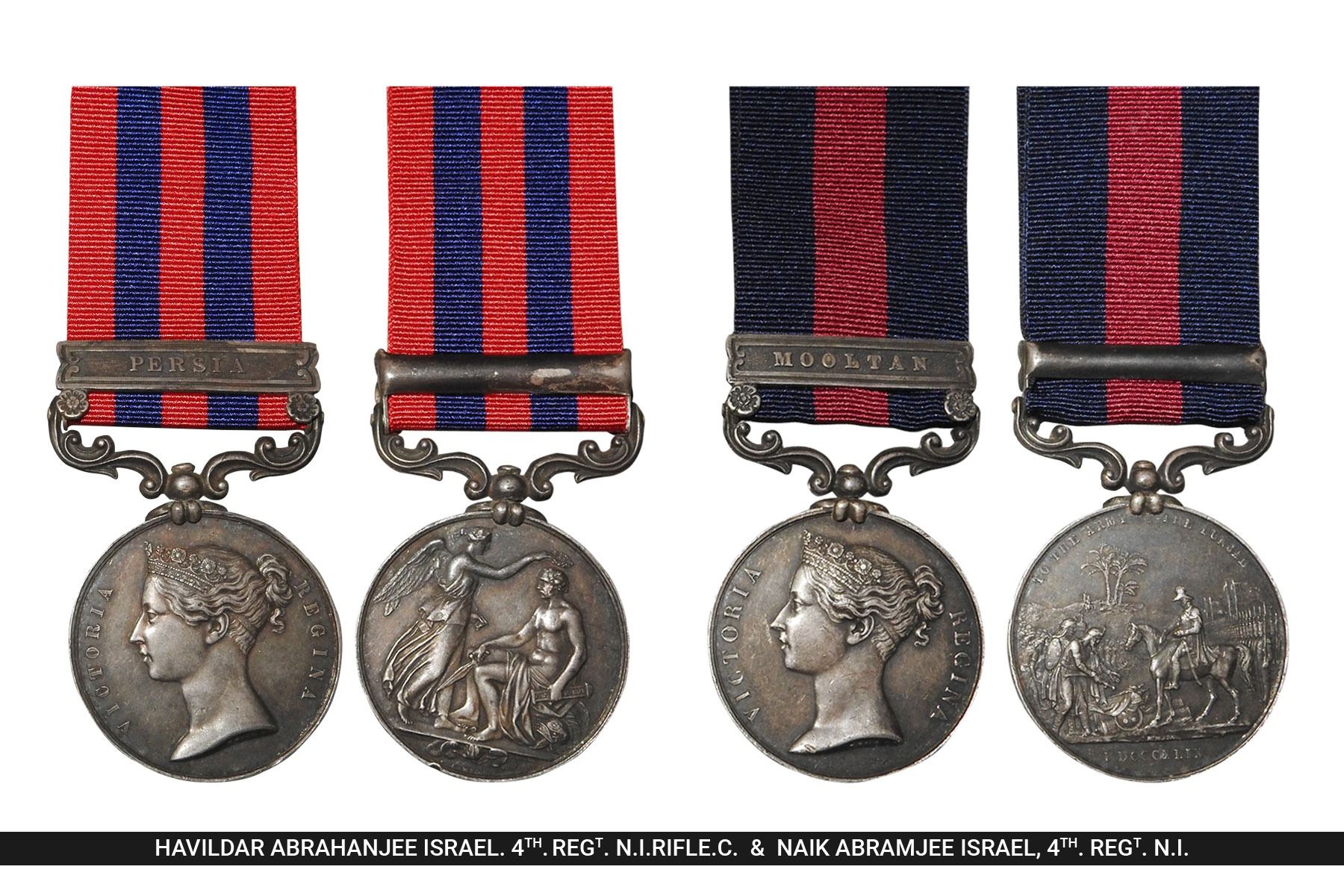 India, An interesting and rare pair of medals to a recipient of the Bene Israel community who took part in the early campaigns of the East India Company. The Persia clasp was the first one in the IGS-54 series that was awarded for overseas service to the British-Indian Army. The Persian war (Dec 1856-Apr 1857) was triggered by the annexation of Herat by the Persians and the British retaliated with a land and sea expedition. The first Victoria Cross to the British-Indian Army was awarded in this campaign. The 'Mooltan' clasp was awarded for the siege of Mooltan during the 2nd Anglo-Sikh war in 1848.49. Abramjee Israel belonged to the Bene Israel community whose members were recruited into the army of the Bombay Presidency. The 4th Regiment of Native Infantry was involved in the assault on the fortress of Mooltan.