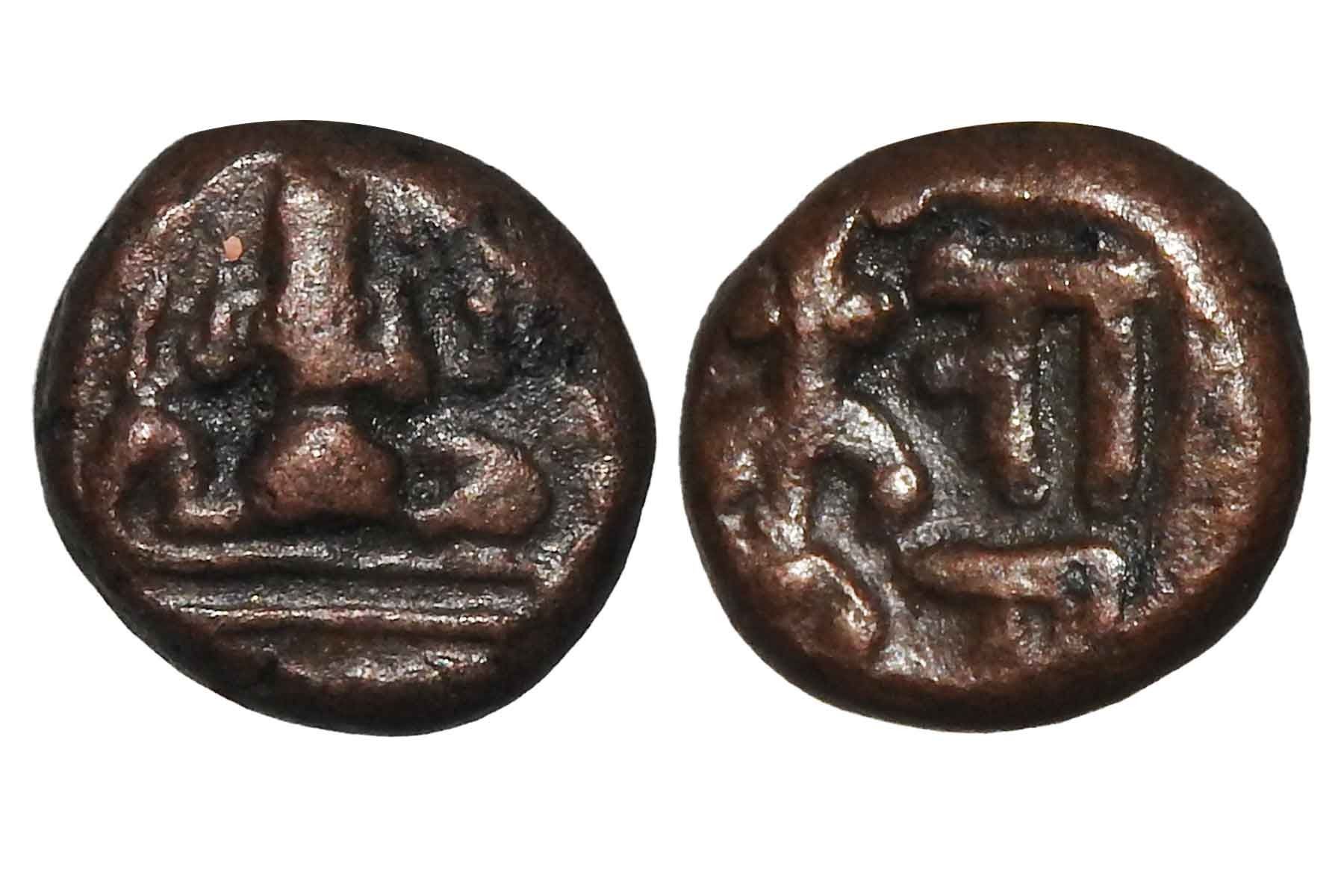 Gingee Nayakas, Copper Kasu in the name of ‘Rama Raya’, (1600-1650 AD), 2.10 grams. Obv. Frontally seated Ganesha, Rev. Dagger, crescent moon and sun in the centre, Devanagari legend “Rama / Raya” on either side, (Ganesh, Tamilnadu 11.8), Very Fine, scarce.
