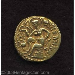 <TABLE cellSpacing=0 cellPadding=0 width="100%" bgColor=#000000 border=0><TBODY> <TR><TD width="100%"><TABLE cellSpacing=1 cellPadding=3 width="100%" border=0><TBODY><TR><TD width="100%" bgColor=#79735c><FONT face=arial color=#ffffff size=3><B>Description</B> </FONT></TD></TR><TR><TD width="100%" bgColor=#ffffff><FONT face=arial size=2><B>India, Gupta Empire. Kumaragupta.</B></I> A.D. 414-455. AV dinar (19 mm, 8.22 g). Horseman type. Kumaragupta on horseback right / The goddess Laksmi seated left on omphalos, feeding grapes to a peacock. BMC Guptas 224; Altekar Class II, 10-1; MACW 4836ff. VF. </FONT></TD></TR></TBODY></TABLE></TD></TR></TBODY></TABLE><BR><A name=PricesRealized></A><TABLE cellSpacing=0 cellPadding=0 width="100%" bgColor=#000000 border=0><TBODY><TR><TD width="100%"><TABLE cellSpacing=1 cellPadding=3 width="100%" border=0><TBODY><TR><TD width="100%" bgColor=#79735c><A name=PR><FONT face=arial color=#ffffff size=3><B>Previous Prices from Heritage Auctions</B> </FONT></A></TD></TR><TR><TD bgColor=#f6f6ed>No Prior Data Recorded </TD></TR><TR><TD bgColor=#ffffff><FONT face=arial size=1 ?>PLEASE NOTE: All prices realized reflect the final hammer price PLUS the buyer's premium in auctions that charge a buyer's premium. Each item has a notation at the top of the listing indicating whether that lot included a buyer's premium. Example: A item that sells with a final hammer price of $100 and a 20% buyer's premium will display with a price realized of $120. All information listed is intended to be as accurate as possible, but errors are possible. Please use this guide carefully and inform us of any inaccuracies. </FONT></TD></TR></TBODY></TABLE></TD></TR></TBODY></TABLE><BR><TABLE cellSpacing=0 cellPadding=0 width="100%" bgColor=#000000 border=0><TBODY><TR><TD width="100%"><TABLE cellSpacing=1 cellPadding=3 width="100%" border=0><TBODY><TR><TD width="100%" bgColor=#79735c colSpan=6><FONT face=arial color=#ffffff size=3><B>Price Guide*</B> </FONT></TD></TR><TR bgColor=#f6f6ed><TD align=middle><B>Grade</B> </TD><TD align=middle><B>Coin World<BR>(Trends)</B> </TD><TD align=middle><B>Numismedia<BR>Retail</B> </TD><TD align=middle><B>Numismedia<BR>Wholesale</B> </TD><TD align=middle><B>Coin<BR>Universe</B> </TD><TD align=middle><B>Heritage<BR>Value Index</B> </TD></TR><TR bgColor=#ffffff><TD colSpan=6><FONT size=1>*All information listed is intended to be as accurate as possible, but errors are possible. No item may be returned or refused based on this information which is provided as a service to our customers. You should contact each pricing source directly to determine the accuracy of this information. </FONT></TD></TR></TBODY></TABLE></TD></TR></TBODY></TABLE><BR><TABLE cellSpacing=0 cellPadding=0 width="100%" bgColor=#000000 border=0><TBODY><TR><TD width="100%"><TABLE cellSpacing=1 cellPadding=3 width="100%" border=0><TBODY><TR><TD width="100%" bgColor=#79735c><FONT face=arial color=#ffffff size=3><B>Population Guide</B> </FONT></TD></TR><TR bgColor=#ffffff> Important notice: Heritage usually auctions material at the rate of 200-250 lots per hour. On some occasions eBay Live bid software or the Internet may not be able to keep up with the pace of the auction. We recommend placing a realistic absentee bid now as insurance to avoid disappointment. Occasionally the auctioneer may eliminate or reject an eBay Live bid, and the auctioneer may also reopen a lot after the close of the eBay live bidding (usually because we missed an audience bid), and may reject your bid even if it shows you as the winning bidder. By bidding via eBay Live, you agree that Heritage may award the lot to another bidder at its sole discretion under the circumstances described above or any other reasonable circumstances. Also please note that all Heritage lots purchased through eBay Live carry a 20% Buyer's Premium. Please make sure you read the Terms and Conditions before you bid.</TD></TR></TBODY></TABLE></TD></TR></TBODY></TABLE>