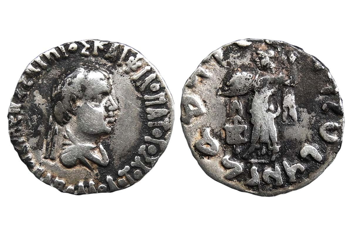 Indo-Greeks, Apollodotus II (c. 65-55 BC), Silver Drachma, 2.23 grams, Obv. Diademed and draped large bust of the ruler to right around Greek legend, Rev. Pallas holding a shield, Tamgha in left field with Kharoshthi legend around (Mitch ACW 2050-51). Fine +.