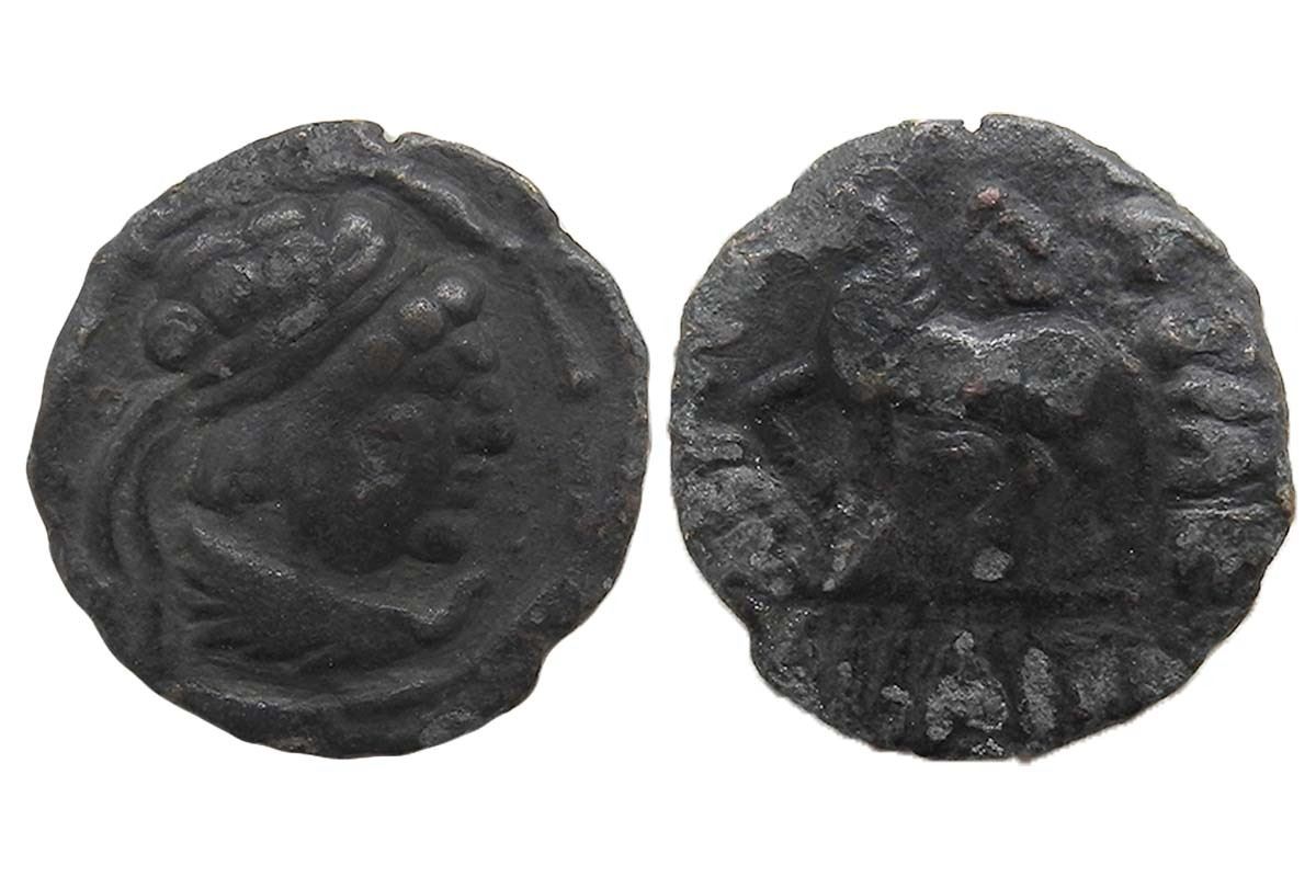 Indo – Scythians, Heliocles, Copper Drachma, 3.10 grams, obv. Diademed bust of the king facing right, Rev. Horse walking to left with foreleg raised and corrupt legend around (Mitch ACW 1879-1883), Fine, Rare.