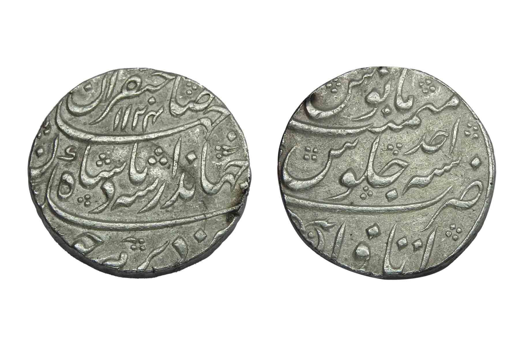 Jahandar Shah, (c. 1712 AD), Silver Rupee, 11.40 grams, Itawa Mint, 1124 AH, RY Ahd (1), Obv. Ruler’s title “Sahib-e-Qiran Sani (the Second Lord of Fortunate Astronomic Conjunctions) Jahandar Shah, Rev. Malus memanat sana julus, zarb Itawa at the bottom, (KM 363.14). Very Fine, Rare.