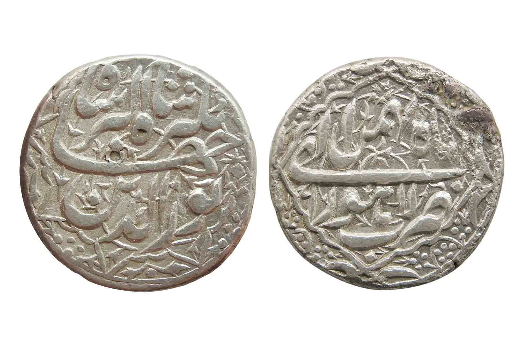 Jahangir, (c. 1605-1628 AD), Silver Rupee, 11.30 grams, Lahore Mint, Obv. Ruler’s title “Noor-ud-din Jahangir Shah Akbar Shah” within the stylized design and with floral decorations with lettering, Rev. Ilahi month Bahman within decorated quatrefoil (KM 145.11). About Extremely Fine, Rare.
