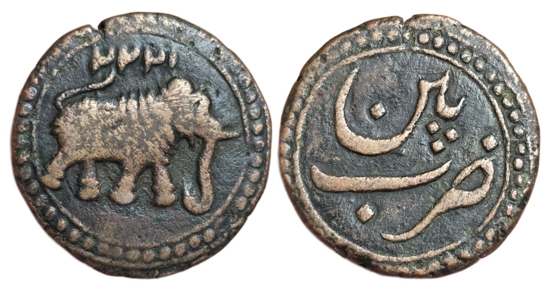 Kingdom of Mysore: Tipu Sultan (AM 1215-1227/ 1782-1787 CE), AE Paisa 1222 AM, Patan mint. Obv: Elephant walking right, date 1222 above retrograde, dotted boarder around. Rev: Mint name Patan within dotted boarder. (KM#123.9). AE Paisa. Extremely Fine. Scarce. Estimate:$ 30-40