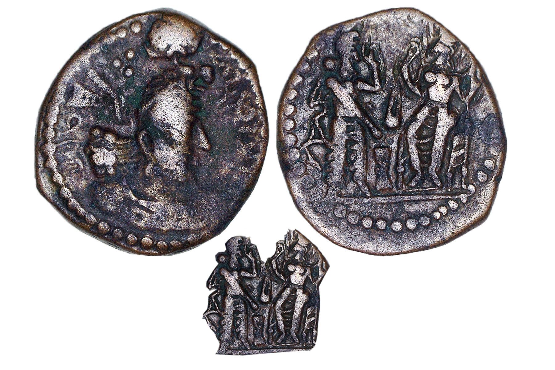 Kusano – Sasanian, Bactrian Series, Hormizd I (c. 275-300 AD), Copper Unit, 2.40 grams, Obv. Bust of the king to right wearing a lion-head crown with ‘globe artichoke decoration above, a legend on the right and dotted border, Rev. Investiture scene involving the king standing on left offering at an altar in front of him and crowing himself with a wreath, a goddess is seated on a chair on right offering the wreath of the investiture to the king. (Gobl 1984, no.1044, Piper 1320) Very Rare.