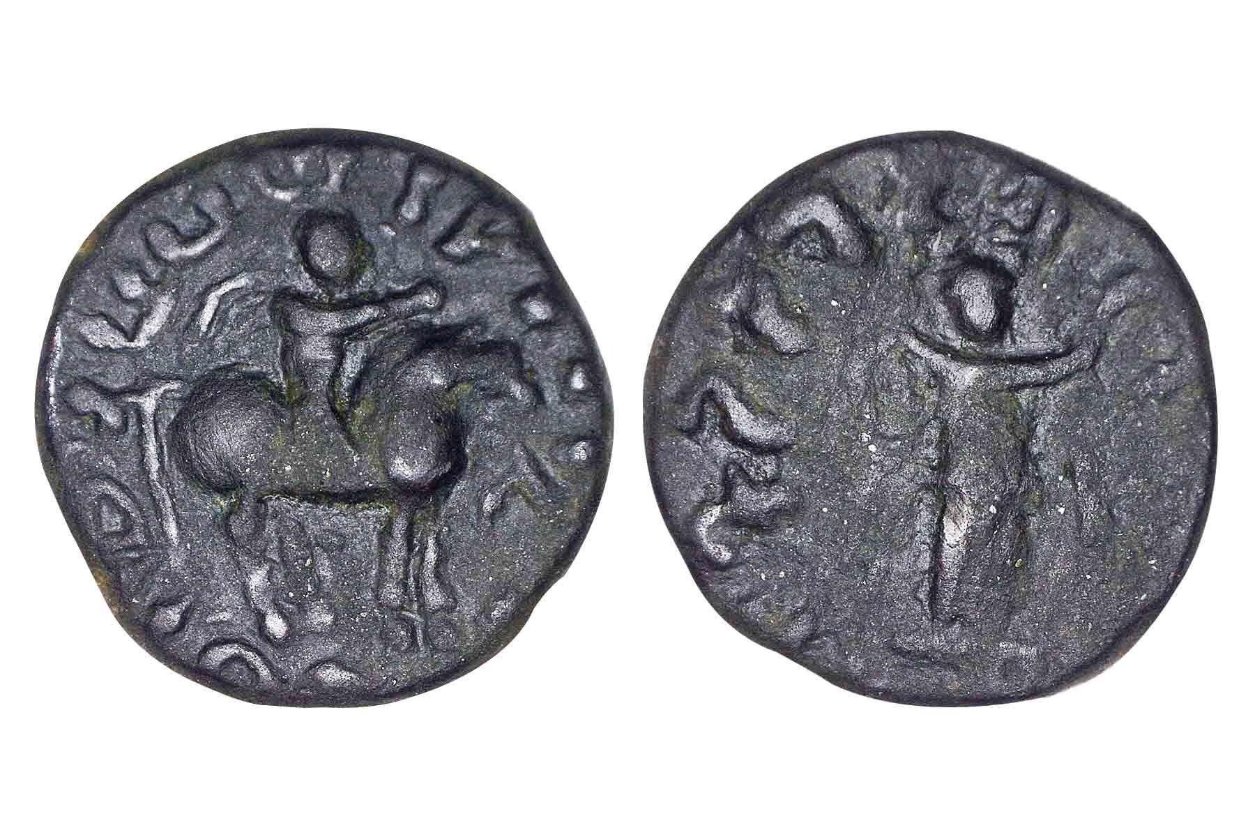 Kushan Empire, Soter Megas, (50-100 AD), Potin Drachm, 2.0 grms, Obv. King on a horse to the right, three-pronged tamgha on right, Greek legend around BACI EWC BACIEWN CWTHP MEAC, “Basileus Basileuon Soter Megas Ooemo Kadphises”, Rev. Zeus standing to right with his left hand holding long sceptre and with his outstretched right hand making blessing gesture, Kharoshti legend around “Maharajasa Rajatirajasa Mahatasa Tratarasa”, (Mitch ACW 2918; Gobl Donum Burnsno.54; Senior B13.1D; Pieper 1178), Fine, Rare in this weight.