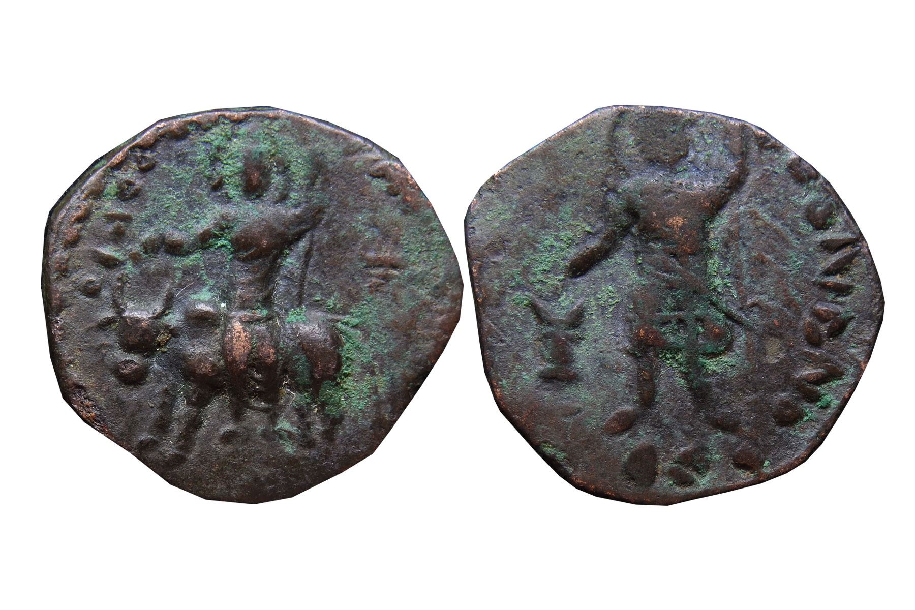 Kushan Empire, Vasudeva (c. 195-230 AD), Copper Drachma, 10.09 grms, Obv. King nimbate standing left, holding a trident to right, making an offering at an altar to left with legend around, Rev. Shiva standing facing before Nandi bull, holding a trident in right and noose in left, tamgha in upper right field (Mitch ACW 3399-3401), Very Fine.