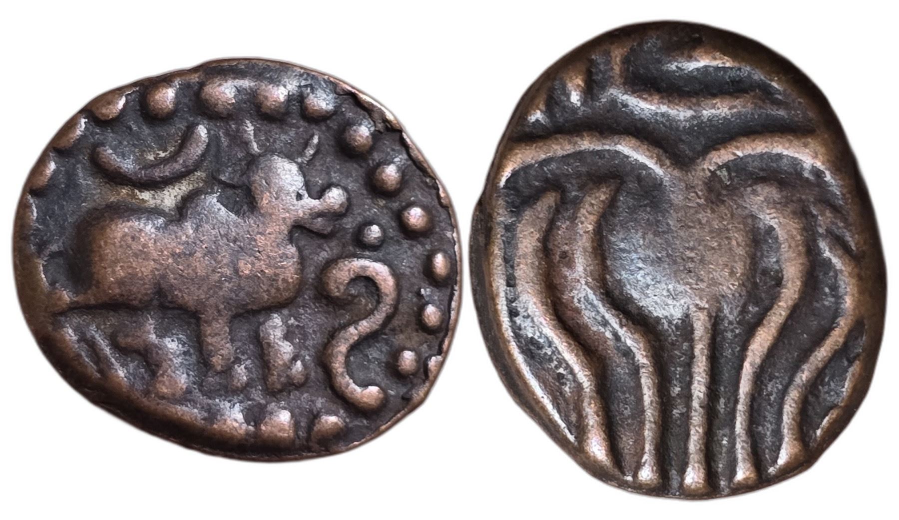 Local coinage issued during Early Vijayanagara. AE Unit, 2.60 g, 16.55 mm. Obv: Bull facing right with a crescent above and a shankh infront. Rev: “Chola†Type standing man as seen on Chola coinage. The Coins of Tamilnadu, K.Ganesh, #13.13. VF, Scarce. Estimate: $ 80-100
