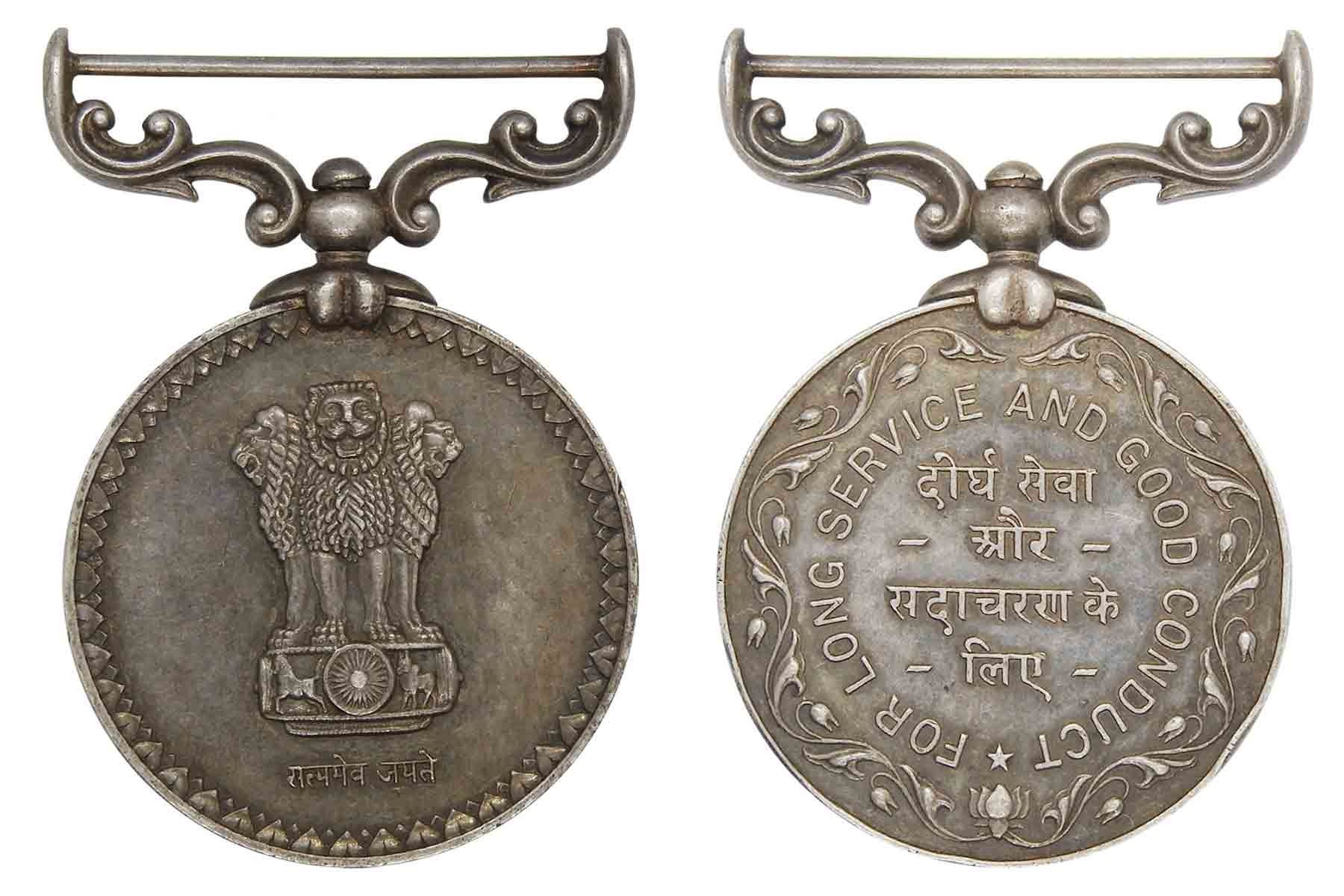 India, Long Service, and Good Conduct Medal, with ribbon mount, Bronze, Awarded to 2535021 L-NK. KUTTY, MADRAS R. Obv. Ashoka Emblem with Satyameva Jayate in Nagari below and design on borders, Rev. within Flower Wreath “For Long Service and Good Conduct” in English and Nagari Legend, Scarce.