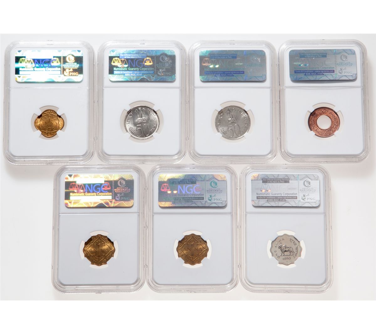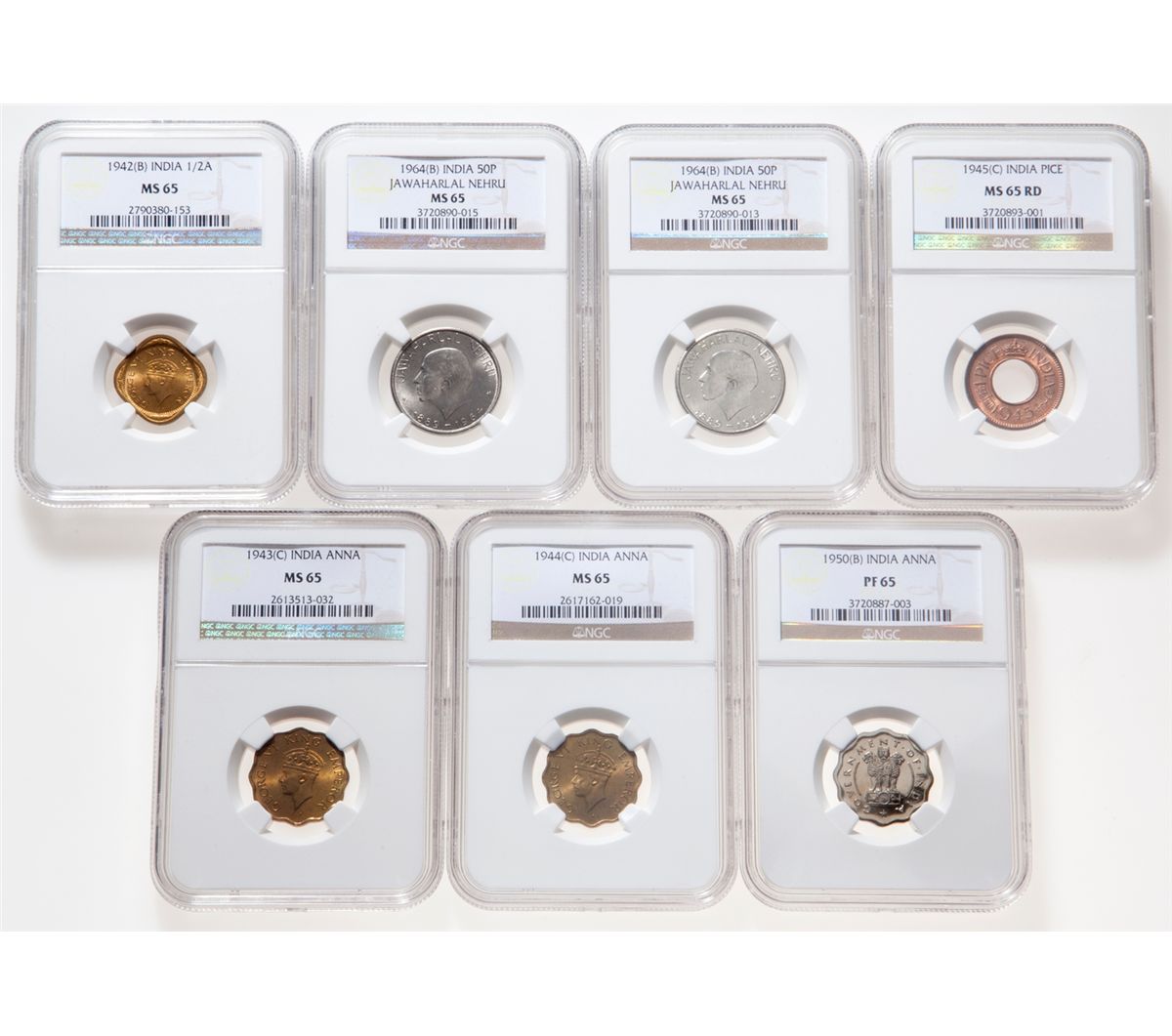 India. Lot of seven (7) PCGS graded Gem coins, including: 1/2 Anna 1942(B), NGC MS-65; 1 Anna 1943(C), NGC MS-65; 1 Anna 1944(C), NGC MS-65; 1 Anna 1950(B), NGC PR-65; Pice 1945(C), NGC MS-65 Red; 50 Paise 1964(B) x2, Jawalharal Nehru, NGC MS-65.