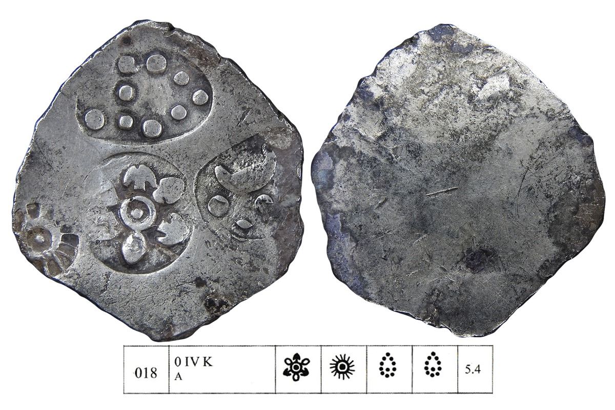 Magadha Janapada, (c. 540 BC), Bimbisara, Silver Heavy Karshapana, 5.40grms, Series 0 G& H 018, Obv. Six-armed symbol, Sun, and two necklaces like symbol. Very Rare, Uncleaned.