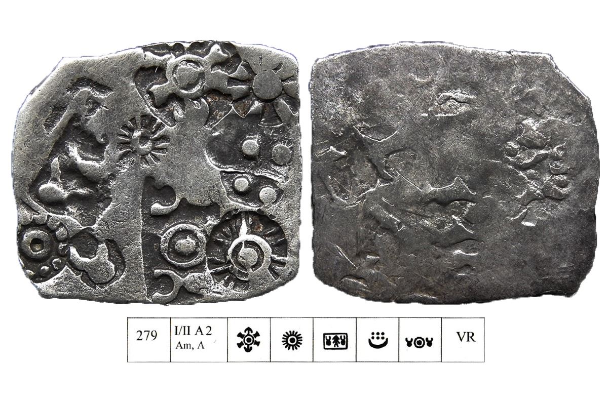 Magadha Janapada, (c. 370 BC), Nanda Dynasty, Silver Karshapana, 3.34grms, transitional Series I - series II G& H 279, Obv. Six armed symbols, sun, and other three symbols, Uniface, Very Fine, Very Rare