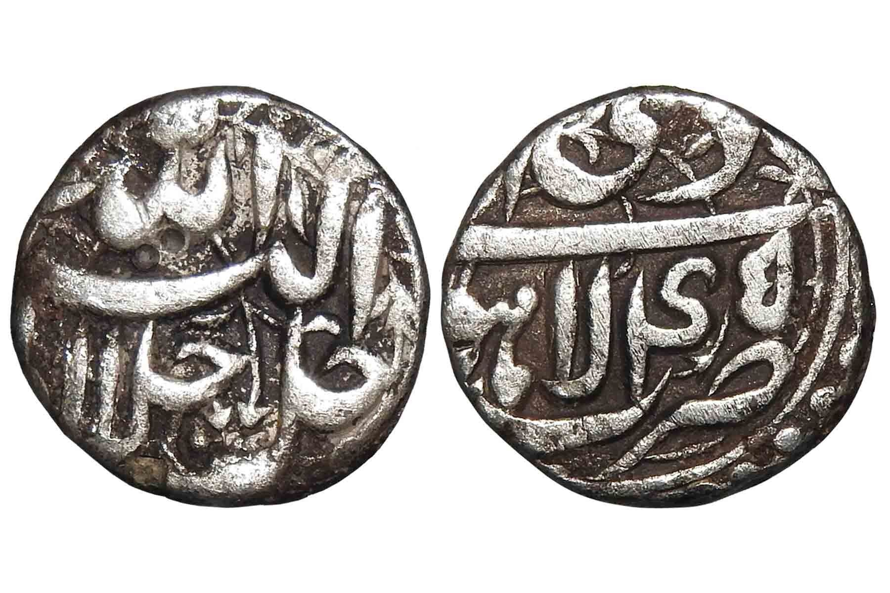 Muhammad Akbar, (c. 1556-1605 AD), Silver Half Rupee, 5.60 grams, Lahore Mint, Obv. Jalle Jalalahu Allahu Akbar, Rev. Ilahi date 42, month Di, Lahore KM 93.11, Very fine, scarce.