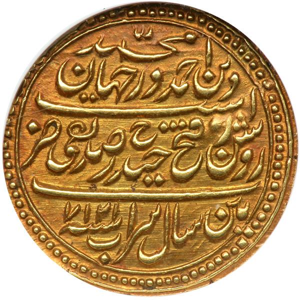 India - Mysore. Gold Double Pagoda, AH1217 (1788). Fr-1355; KM-A129. Tipu Sultan, 1782-1799. Persian legend each side. Rare. NGC graded MS-61.