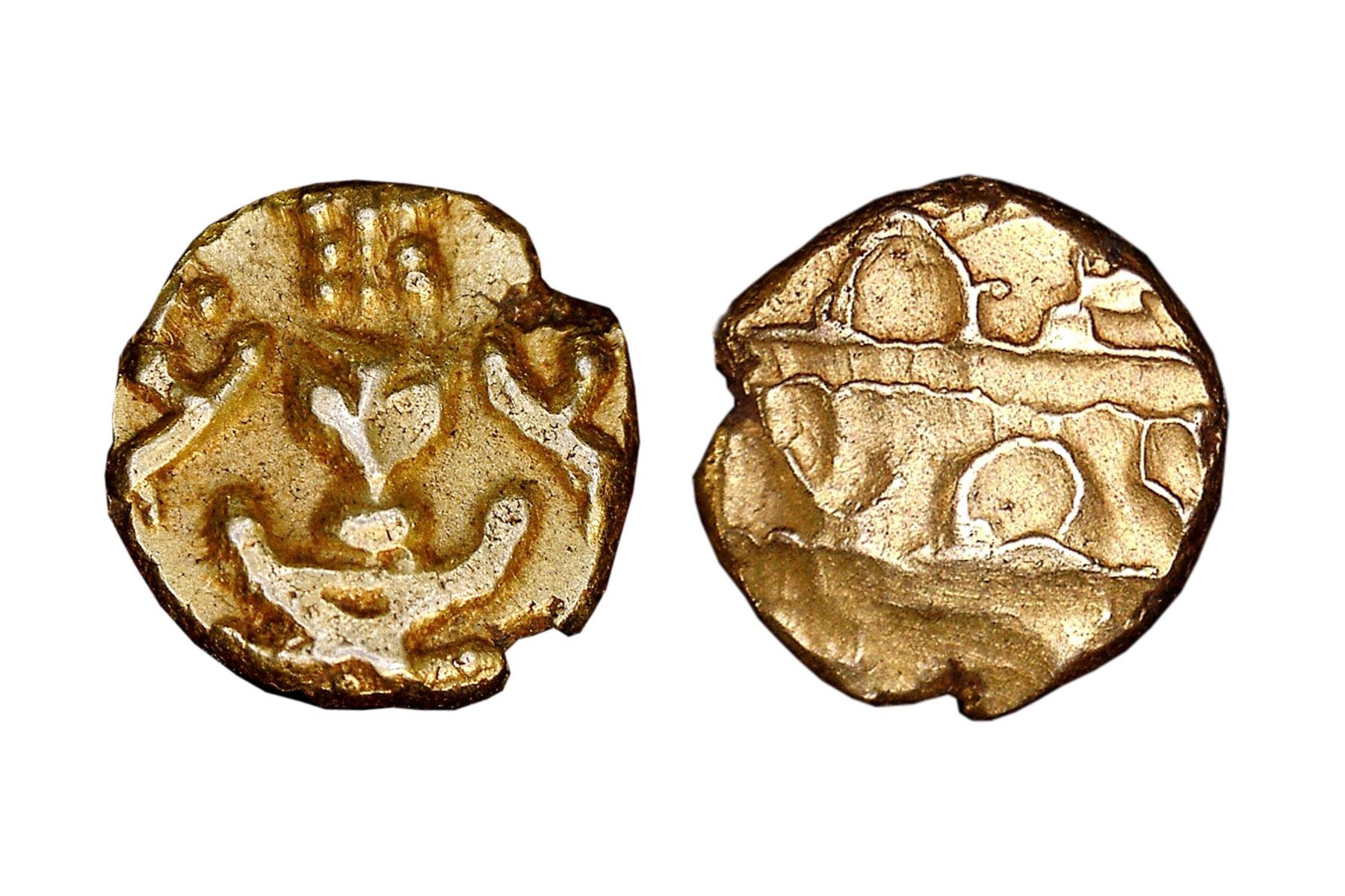 Mysore, Kanthirava Nasaraja Wodeyar, (c. 1638-1662 AD), Gold Fanam, 0.40 grams, 5 mm, Obv. Seated God Narasimha, the fourth avatar of God Vishnu, Rev. Sri / Kanthi / Rava in Nagari, (Ganesh, Karnataka Coins 14.2), Very Fine+, Scarce.