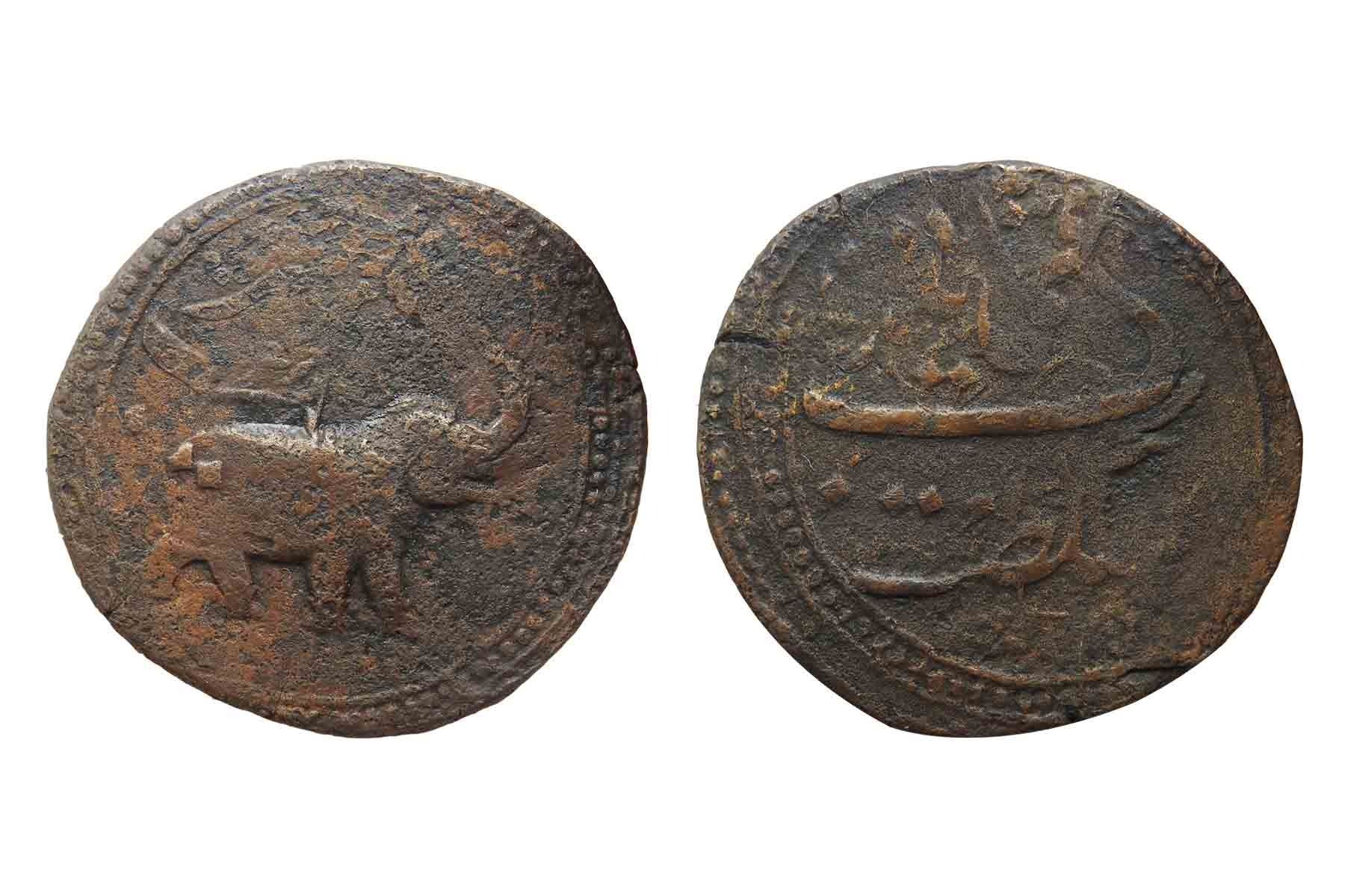 Mysore, Tipu Sultan (c. 1782-1799 AD), Copper Two Paisa, 21.10 grams, Nagar Mint, Obv. Elephant with raised trunk moving towards the right, Rev. Persian legend Dar al-Sultanat Nagar, overstruck with opposite sides on the similar issue (KM 104.1), Very Fine, Very Rare.