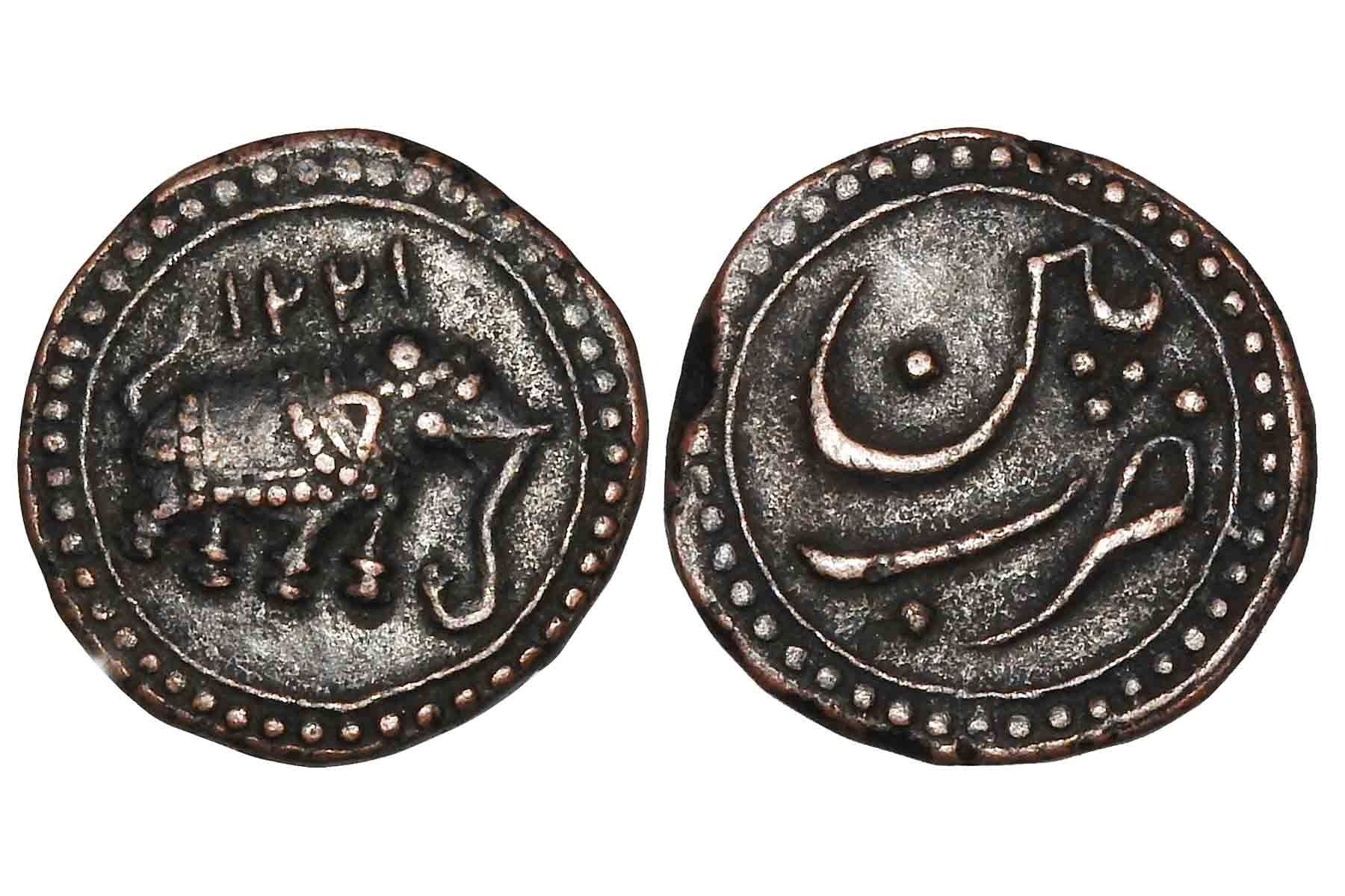 Mysore, Tipu Sultan (c. 1782-1799 AD), Copper Paisa, Patan Mint, 11.20 grams, Obv. Elephant towards the right, 1221 AH date, Rev. Zarb Patan mint name, (KM 122.2), Very Fine, Scarce.