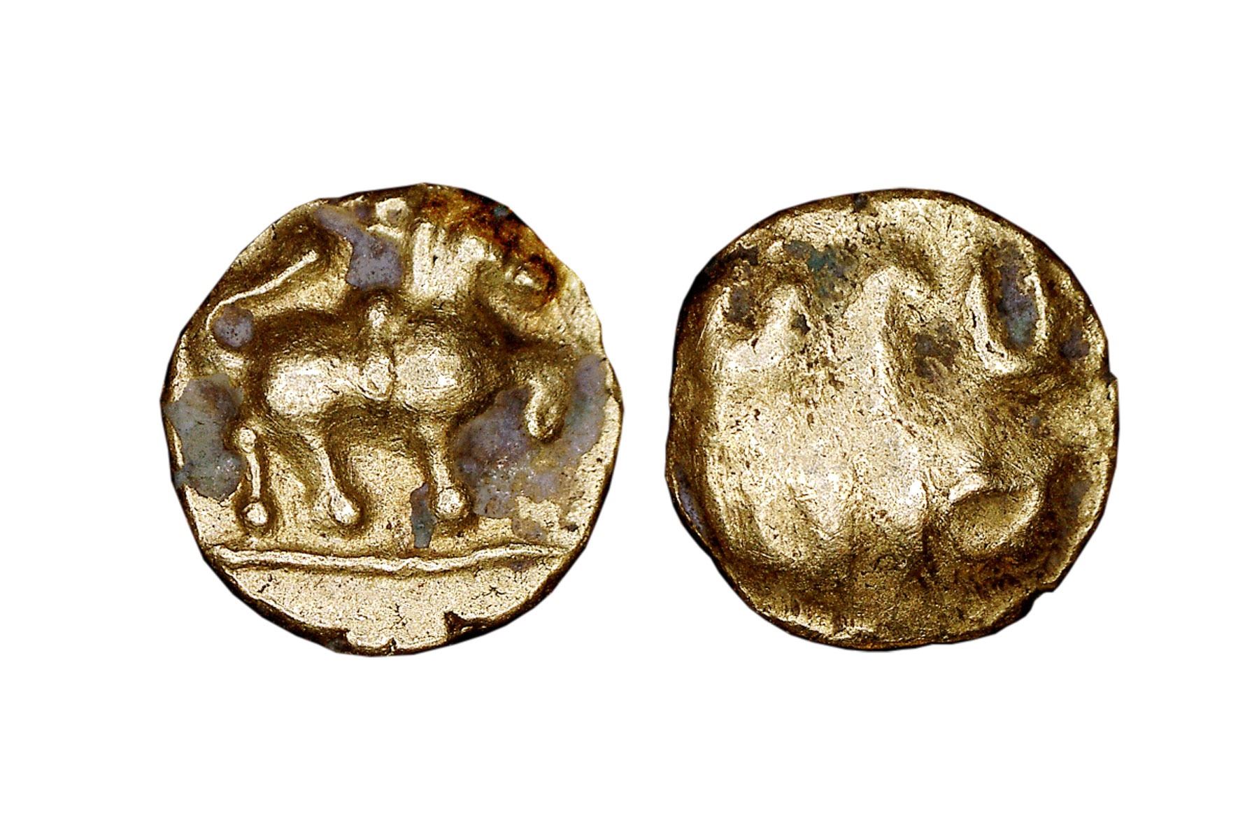 Nandini Durga, Unattributed Gold Fanam, 0.40 grams, Obv. Nandi facing front with left limb raised like a horse moving towards the right, Rev. crude Nagari legend, Very Rare.
