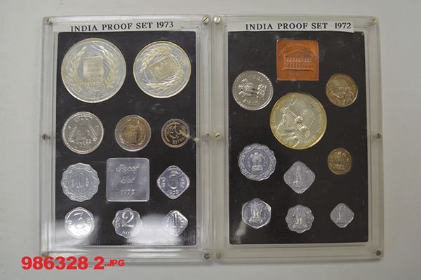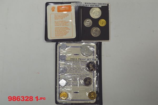 India. Republic. Uncirculated Sets 1969 Ghandi Centennial. Proof Set 1969, 1970, 1973, 1974, 1975. The later are in hard plastic cases with card and card covers. Some nice large silver coins included. 54 pieces.