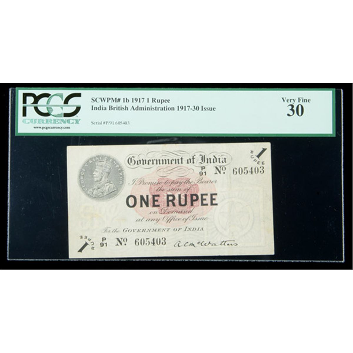India SCWPM# 1b, 1917 1 Rupee. PCGS Very Fine 30. . Fr-P-1b. This mid-grade circulated example is free of any major flaws save for the typical circulation seen on most examples. This is a very scarce early issue, and is seldom seen any finer.