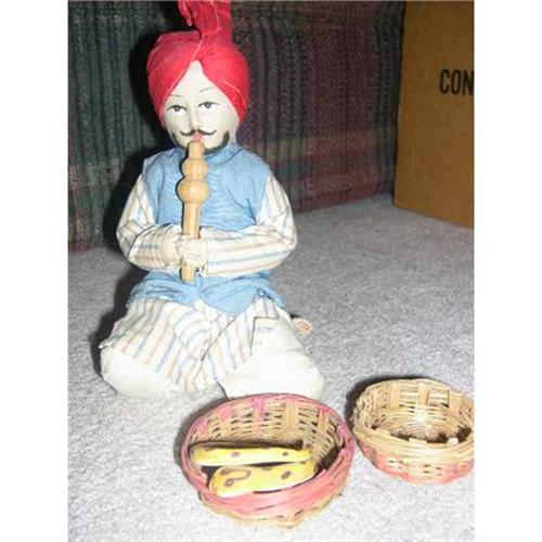 8" sitting cloth India Snake Charmer. Paper tag reads hand-made. India 80 Rs. AS. Snake Charmer