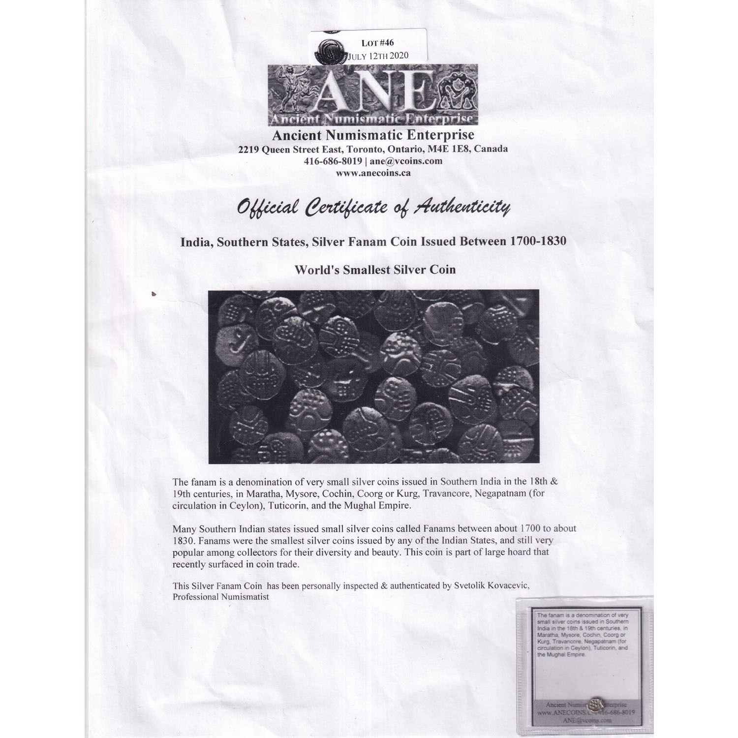 India, Southern States, Silver Fanam Coin Issued Between 1700-1830. These coins are the world's smallest silver coins and are still popular among collectors for their diversity and beauty.