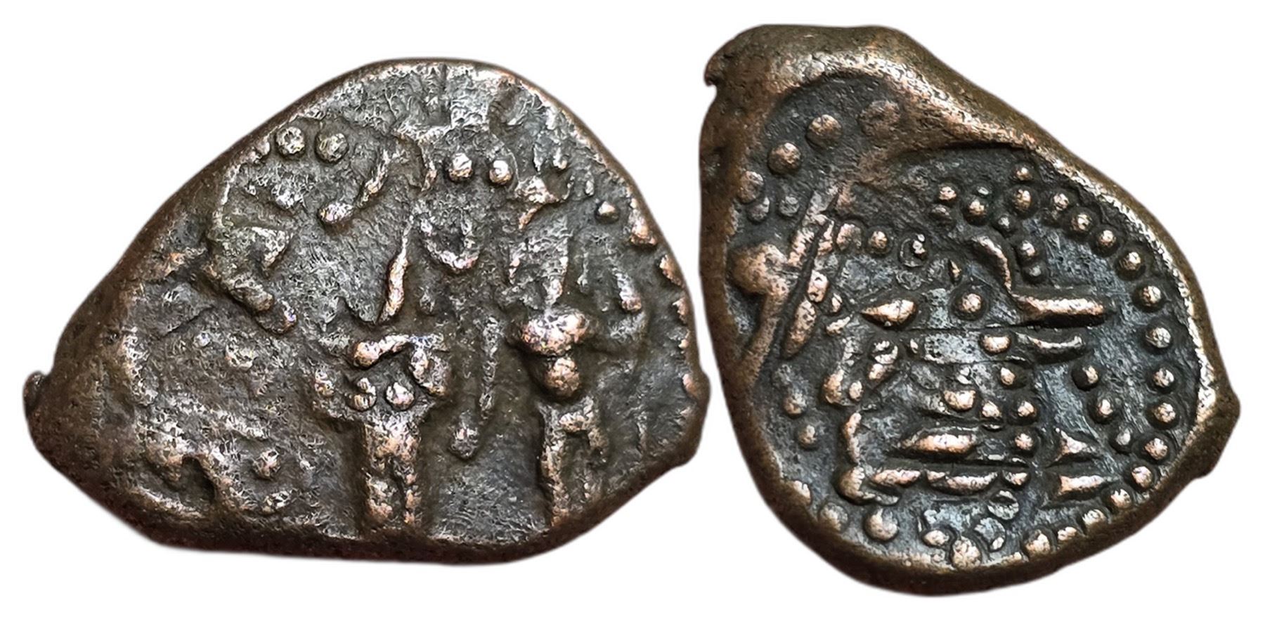 Thanjavur Nayakas: AE Unit, 3.40g, 17.67 mm. Obv: Rama and Lakshmana. Rev: Siva linga. The Coins of Tamilnadu, K.Ganesh, # 12.8. VF, Scarce. Estimate: $ 60-80