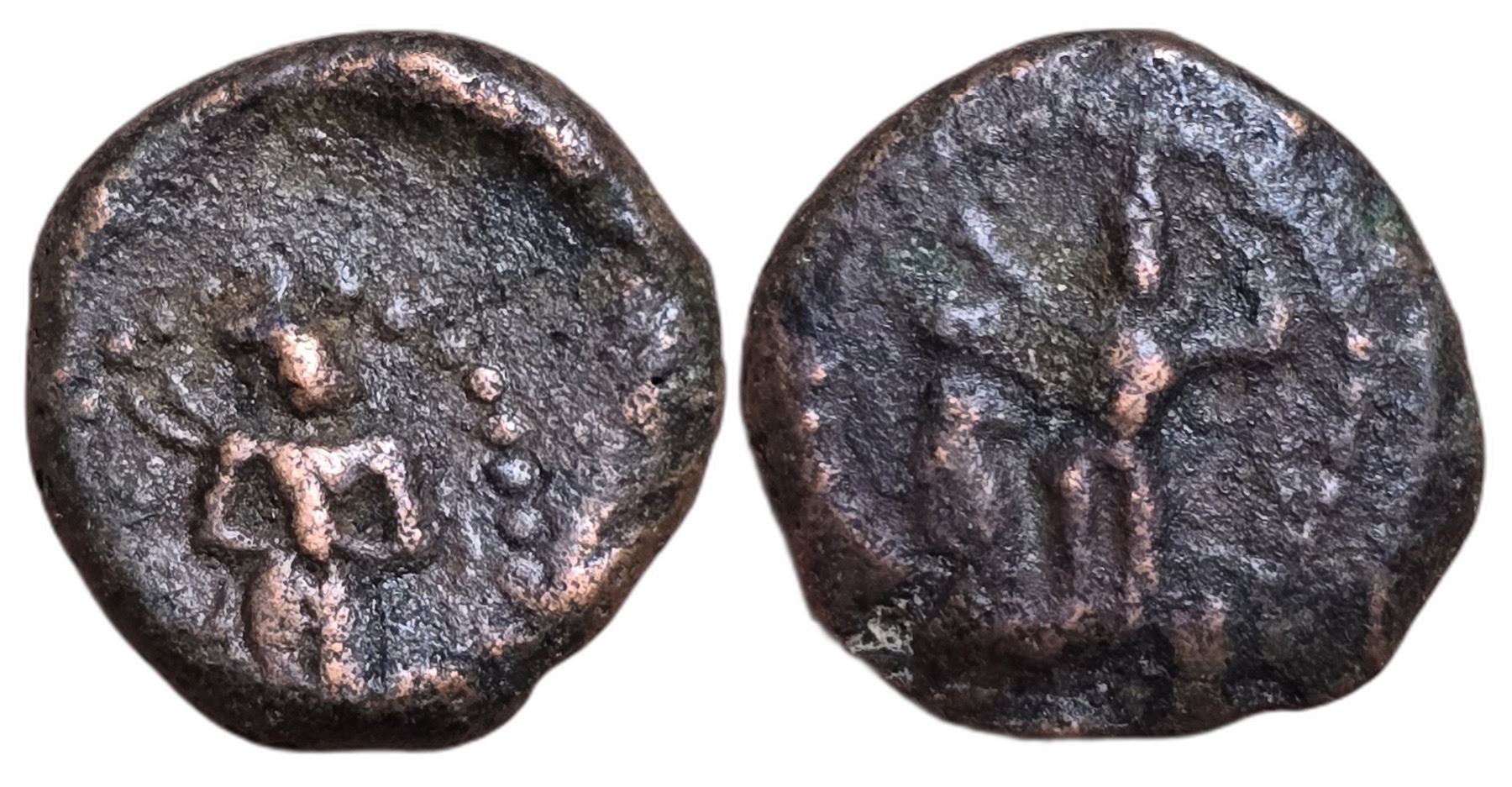 Thanjavur Nayakas: AE Unit, 3.43 g, 14.87 mm. Obv: Standing King in Anjali mudra. Rev: Lord Rama and Hanuman. The Coins of Tamilnadu, K.Ganesh, # 6.37. Near VF, Scarce. Estimate: $ 80-100