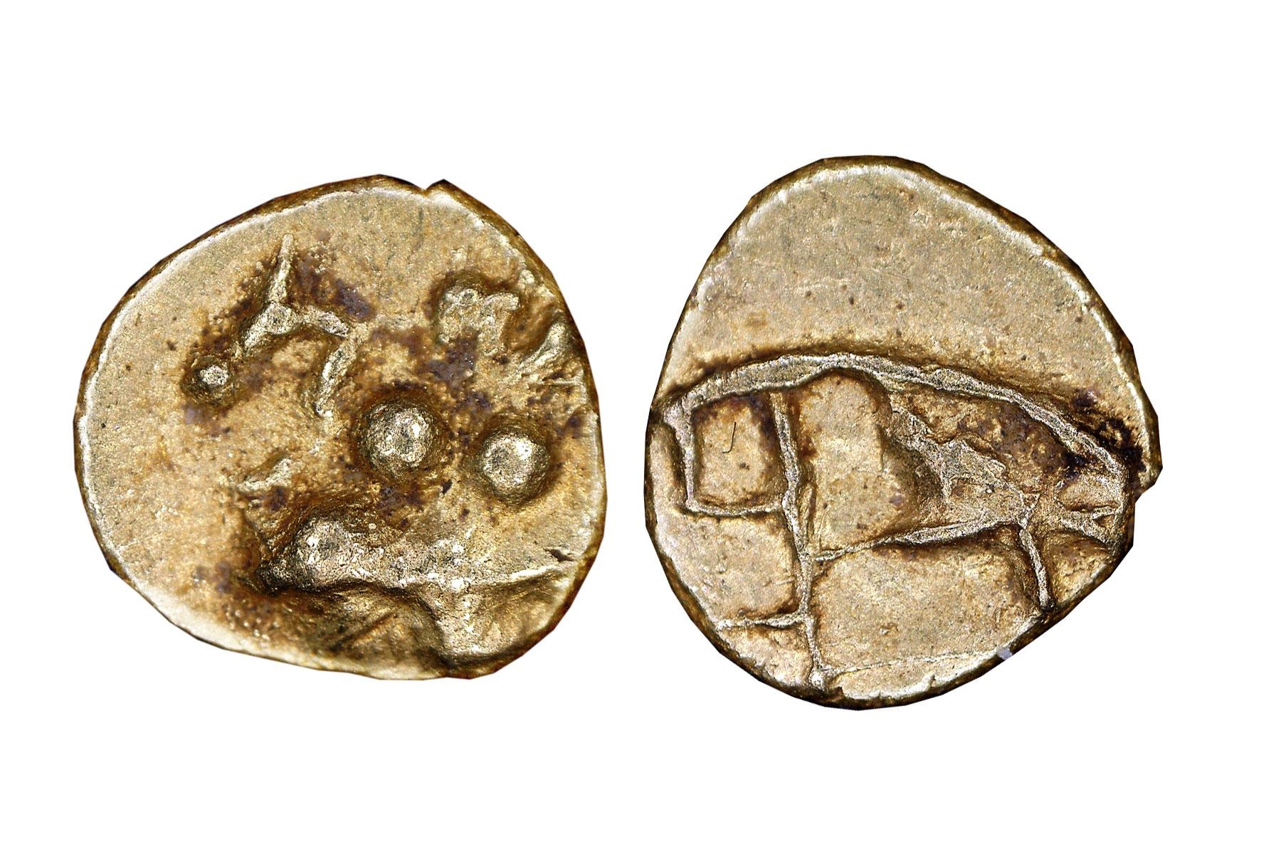 Unattributed, Gold ½ fanam 0.20 grams, Obv. Seated Female figure, Rev. Corrupt Nagari legend, Rare.